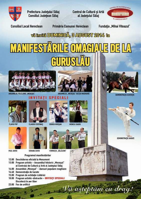 Duminică, 3 august 2014, vor avea loc manifestările omagiale de la Guruslău. Deschiderea oficială de la Monument va avea loc la ora 12. De la ora 13, Ansamblul Meseșul al Centrului de Cultură și Artă al Județului Sălaj, cu secțiile română și maghiară, va oferi un program artistic. În desfășurarea evenimentului vor mai avea loc demonstrații de karate, program de echitație, program artistic – distractiv și foc de artificii. Evenimentul este organizat de Instituția Prefectului Județului Sălaj, Consiliul Județean Sălaj, Centrul de Cultură și Artă al Județului Sălaj, Consiliul Local și Primăria comunei Hereclean, Fundația Mihai Viteazul.