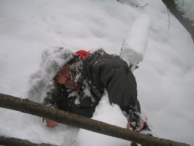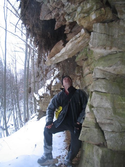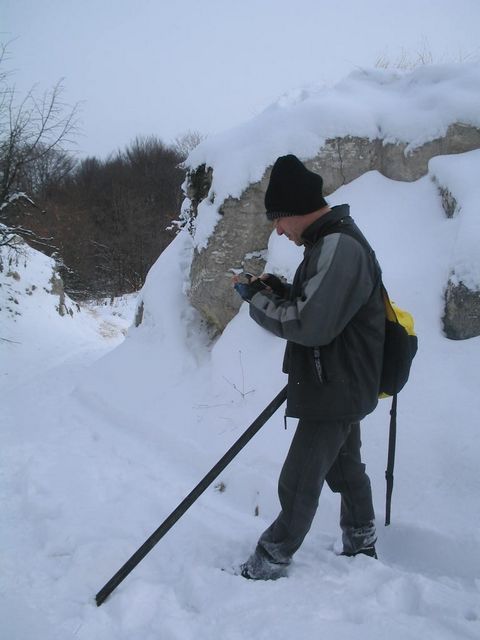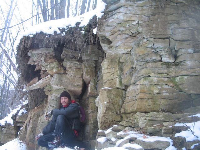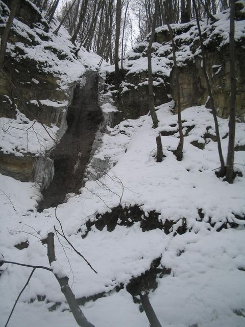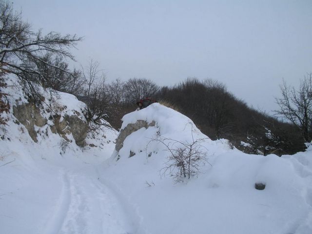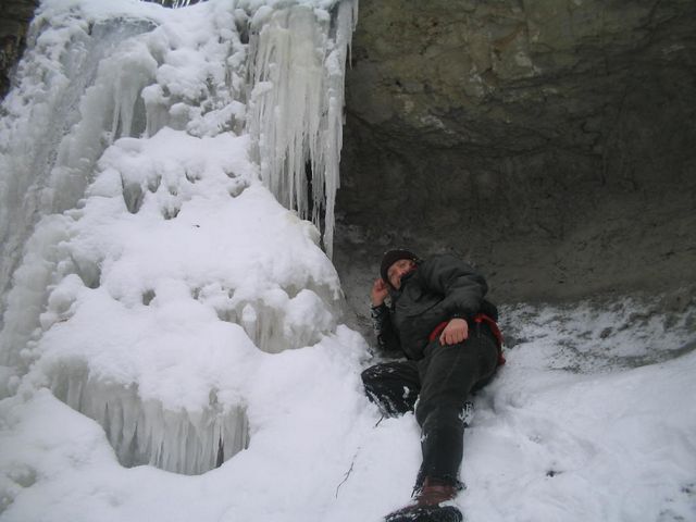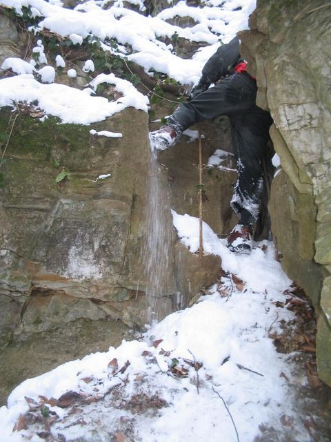 Cautam un traseu de coborare spre fundul prapastiei, de unde sa putem explora turturii de gheata pe care i-a lasat in urma cascada care, azi-vara, umplea, cu susurul ei, valea parca uitata de lume de pe Meses. Ne taram, intai, cu pasi mici si cu multa precautie spre coborarea verticala, de care ne-am folosit si vara trecuta. Nu se poate face nimic, totul este sub zapada, fiecare orificiu din stanca abrupta care ti-ar putea veni in ajutor, este astupat de zapada. Sub care e gheata. Nici macar noi, care am trecut prin multe provocari, nu ne lasam atrasi de aceasta posibilitate. Ar mai ramane legarea unei franghii de trunchiul unui copac cazut peste vale, chiar la buza cascadei, dar in conditii de ger, coborarea libera pe o franghie este destul de neplacuta. Asa ca, nu ne mai ramane decat sa inconjuram prapastia, incercand intrarea in ea, prin cealalta parte a vaii. Un traseu la fel de periculos, avand in vedere ca trebuie mers pe o panta inghetata, cale de vreo 200 de metri. O panta in 80 de grade, acoperita cu zapada fina, ce nu te mai lasa sa vezi, nici macar sa simti crengile si bolovanii de sub talpa. Plus crengile casante din jurul tau, care cedeaza la orice mica atingere. Ne miscam doar pe canturi, centimentru cu centimentru.