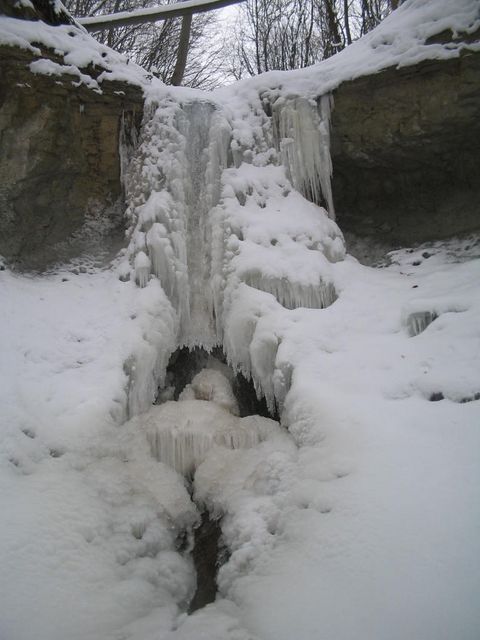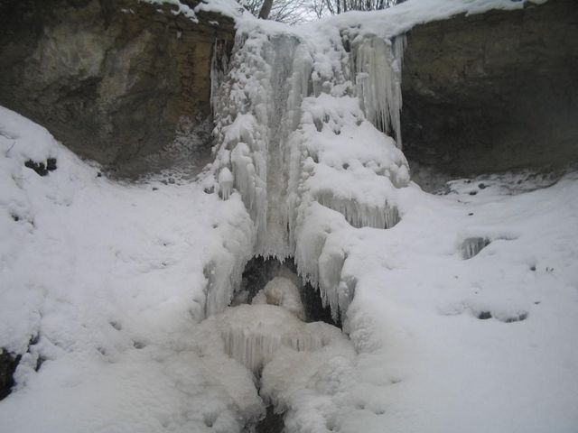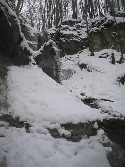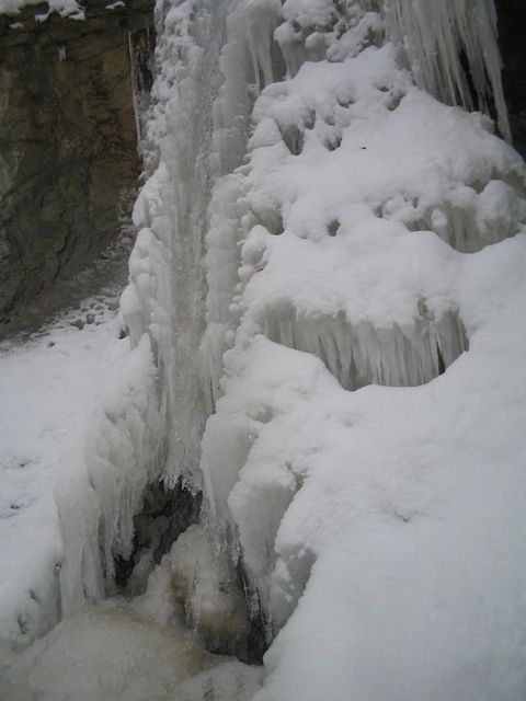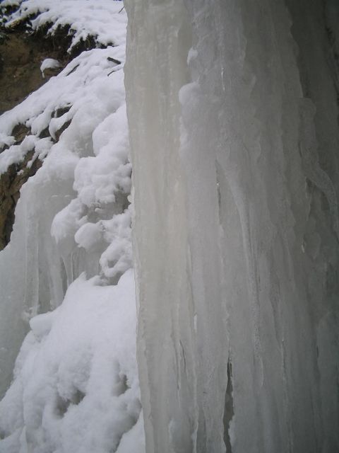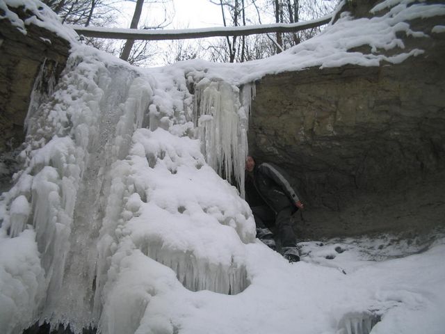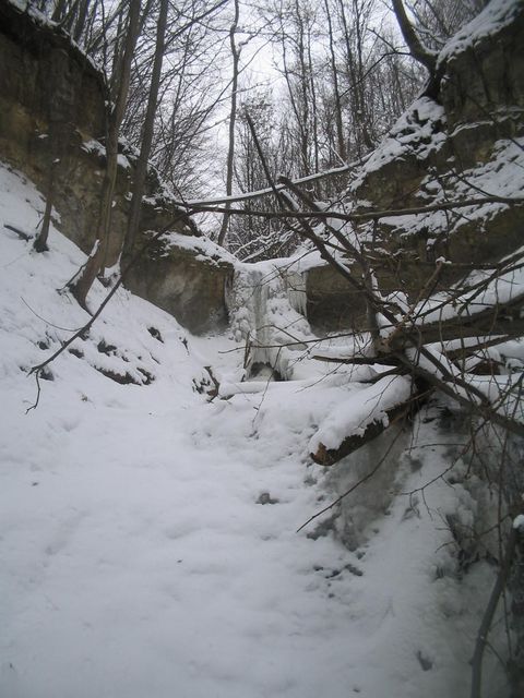 Ca sa putem intra in prapastia unde cascada s-a transformat in turturi de gheata, trebuie sa urcam din nou si sa facem echilibristica pe o panta inselatoare de vreo 80 de grade. Alunecam des, nimic nu este in siguranta sub talpile noastre, nici o creanga de care te prinzi nu-ti poate oferi senzatia de linistire. Totul fuge de sub talpile noastre, iar crengile se rup la cea mai mica atingere. Ne ajutam, unul pe altul, cu bokken-ul, e dificil, dar traseul merita, dam peste o aglomerare de stanci in care bolovanii sunt pusi, parca, straturi peste straturi, de o mana umana. Dar totul e natural, mai ales bucata de stanca care atarna, amenintatoare, chiar peste capul meu. Schimband bokken-ul de la o mana la alta, il scap si acesta curge, linistit, chiar in rau, trecand ca un schior in saritura, peste buza vaii. Ajungem si noi acolo, primul meu gand este sa sar dupa el, dar simt, parca, o mana ce ma trage inapoi. Saritura ar fi una de la circa 8 metri, fara probleme, dar locul de aterizare ar fi chiar panta din fata, care nu-ti da nici o sansa de atenuare a caderii. Nu stiu cum, dar simt, izbitura ar fi ca a unei locomotive. Renunt. Nu si Calin, care apare din spatele meu si, fara sa ia in seama atentionarea mea, trece, in zbor, peste vale.