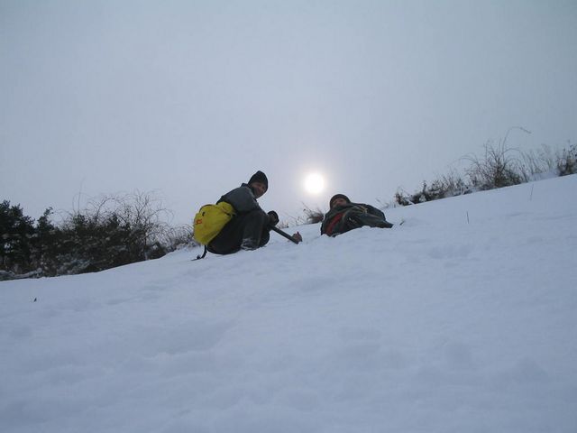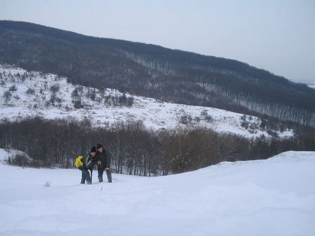 O opresc pe aia mica imediat dupa ce ies de pe “europeana”, pe drumul ce duce spre Tabara Meses. Vorba vine “o opresc”, se opreste ea, unde vrea, pentru ca intru intr-un derapaj lent, chiar placut, fara nici un pericol, care face ca timpul sa se incetineasca. Iesim din masina, ne luam echipamentul precar, nici nu avem nevoie de mare lucru, doar de un cutit de vanatoare si un bokken, pentru eventualii caini, care s-au obisnuit, prin acea zona, sa sara la gatul aventurierilor. Cu atat mai rau pentru ei: nici unul dintre noi nu am mai exersat, pe viu, de mult, cu bokken-ul. Ne aruncam, in mars fortat, spre panta, puternici, odihniti, dupa aproape trei saptamani de odihna fortata. Dar aerul rece isi croieste drum, parca cu cutitul inspre plamanii nostri, in timp ce zapada, din ce in ce mai neatinsa, ne face drumul si mai greu. Dar ce mai conteaza: suntem in elementul nostru, gafaim, in cateva minute suntem uzi leoarca in aerul de minus 10 grade de afara, continuand accesul pe o panta, cu zapada neatinsa, ce duce spre creasta. Din cand in cand ne mai oprim, piepturile ni se comporta ca niste aspersoare, singurele zgomote care se mai aud sunt doar suieraturile noastre. Nu mai avem mult pana sus, pe creasta, aproape ca o luam la fuga, dar merita: privelistea care ni se deschide sus, in fata ochilor, este atat de plina de viata si in acelasi timp atat de lipsita de orice miscare, incat iti da senzatia trecerii spre o alta dimensiune.