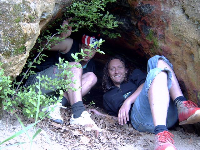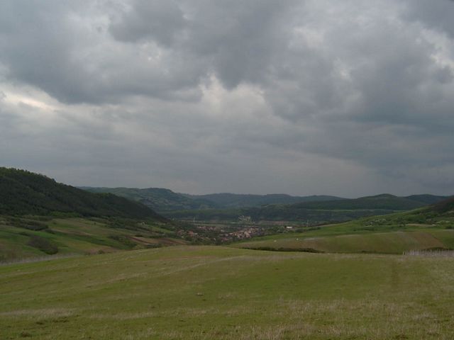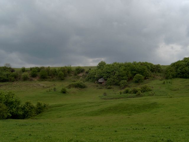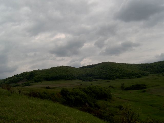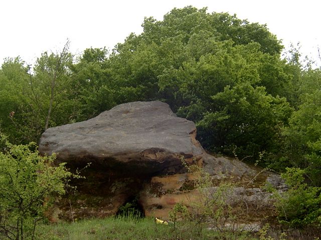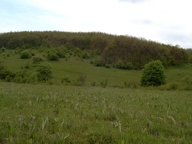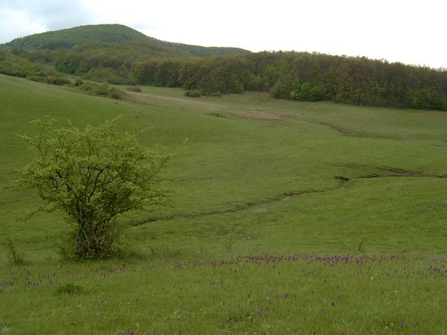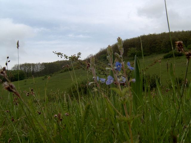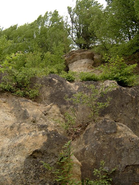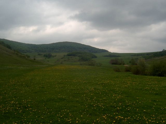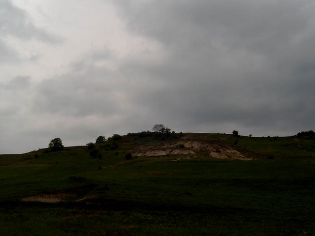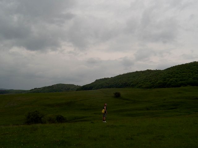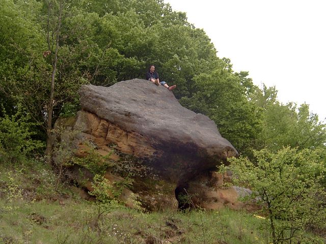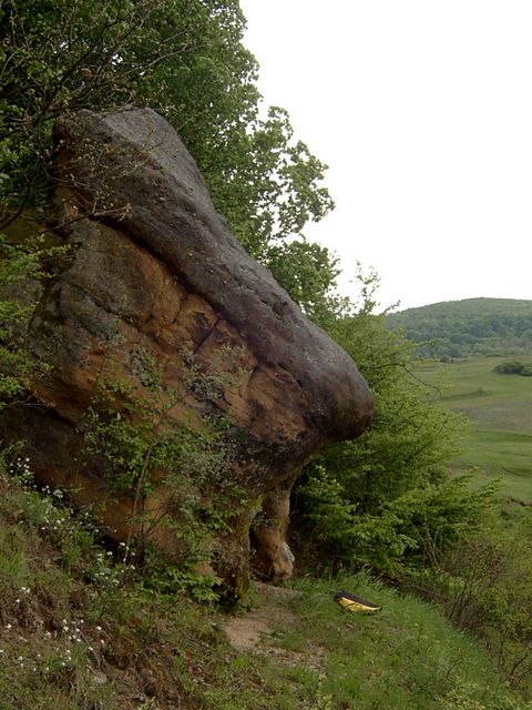 Trebuie sa intram prin padure, sa gasim o vale, dar nu cumva sa o luam spre dreapta ca ajungem in Baica, chiar in zona “Rupturilor”. E ciudat traseul, cand urci, cand cobori, drumul este plin de delusoare. Unul dintre ele parca ar fi colorat in albastru, ceea ce nu prea arata normal in verdele intens din jur. Mergem in acea directie si in fata ne rasare o alta poiana presarata cu niste flori albastre, despre care aveam sa aflam mai tarziu ca se numesc, popular, “pizda tigancii”. Oricum, florile-s superbe! Gasim, apoi, relativ usor valea din padure, o urmam si iesim pe creasta unui alt deal, de pe varful caruia vedem, undeva destul de departe, ceva ce seamana a OZN. Este chiar ceva in forma ovoidala, asezata chiar la liziera unei padurici, intr-o zona in care nu au ce cauta conglomerate de gresii. Mai de aproape, OZN-ul seamana cu o ciuperca imensa, dupa care aduce perfect cu o casuta. De fapt, ne-am dat seama, este vorba de Piatra Catusii, o piatra inalta de circa 6 metri, chiar cu o forma de ciuperca, cu o cupola si care are la baza o gaura care iese, ca un tunel, pe cealalta parte. Poate, ne gandim noi, dracul si-a bagat coada si in cazul acesta, ca la Stanca Dracului, doar atat ca in acest caz a cam ratat tinta!. Putin mai incolo mai dam peste ceva pietre destul de mari, dar sunt erodate. Oricum, interesant e faptul ca nu prea au ce cauta pe acolo, zona nefiind una calcaroasa. Ne cataram pe ele, urcam dealul in continuare si ajungem pe o creasta de unde poti cuprinde cu privirea toata zona.