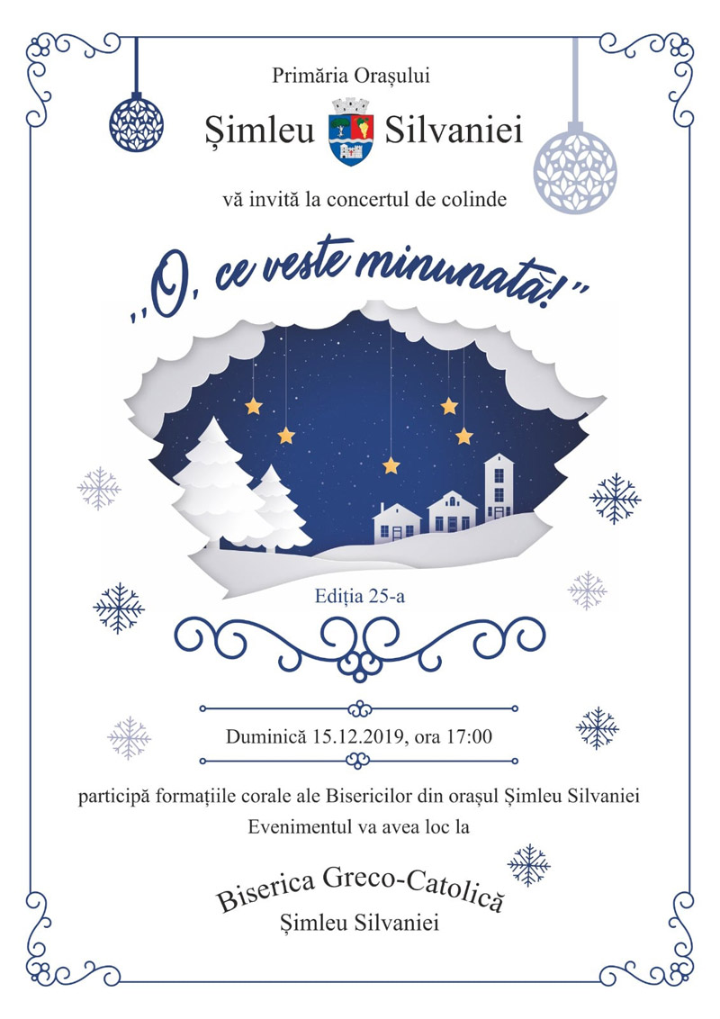 Tradiţionalul Concert de Colinde susţinut de formaţiile corale ale bisericilor din oraş va avea loc duminică, 15 decembrie 2019, începând cu ora 17.00, la Biserica Greco Catolică.