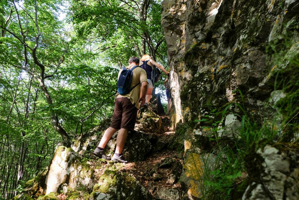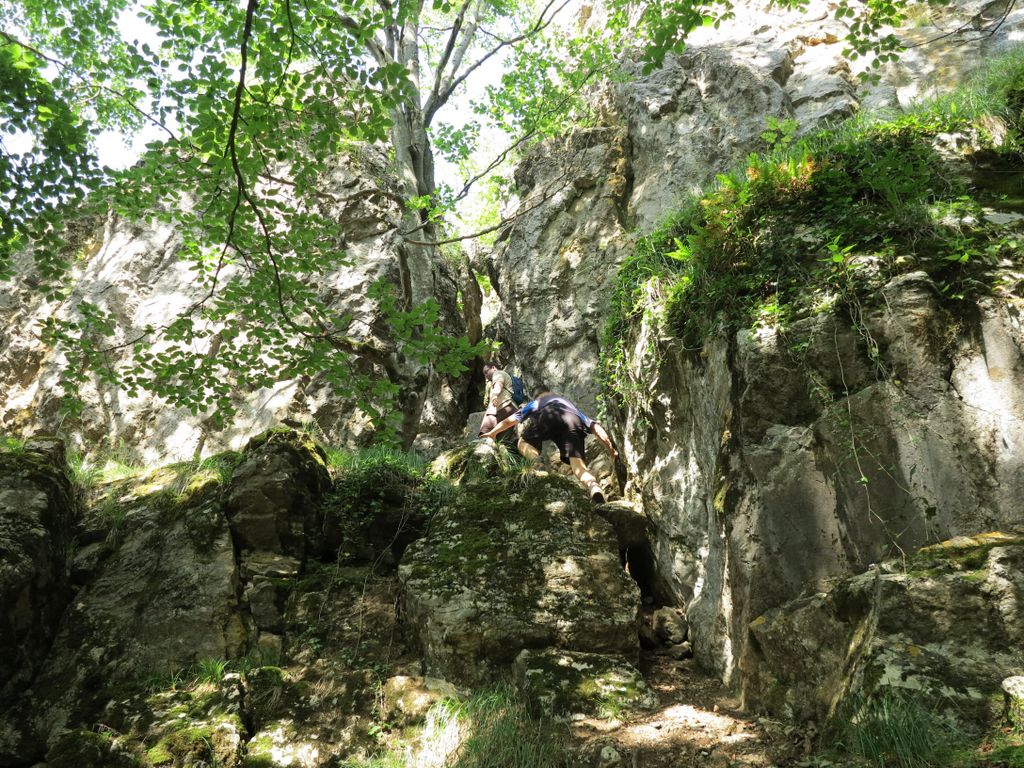 Însă, înainte ca Florina să mă sperie cu poveștile ei, după ce am ridicat tabăra și am mâncat câte un sandviș, am făcut o mică incursiune în jur, am coborât la baza stâncilor, pentru o tură scurtă pe lângă stâncile masive, dure, de la marginea pădurii. Și, deși aveam furnici pe toată talpa, vorba lui Alexandru Andrieș, atunci când am ajuns lângă stânci, eram aproape sigur că o să le dăm ocol, și atât. Spre bucuria mea, însă, Andrei a fost stârnit de poveștile mele despre hornul-crevasă dintre stâncile imense, și a dat semne de curiozitate. Numai bine pentru mine, că aveam pretext, acum, ”că doar n-o să-l las pe Andrei fără cineva care să-i asigure spatele”. Așa că am lăsat aparatul de fotografiat la baza stâncii, le-am spus Ginei și Florinei să rămână acolo, că mă întorc după ele, și, împreună cu Andrei ne-am bucurat de cățărarea prin hornul-crevasă. Da, știu că ăstea, crevasele sunt niște despicături într-un ghețar montan, dar pentru mine despicătura asta dintre stânci așa îmi părea. Horn-crevasă, pentru că, în ultima parte a crevasei, trabuia să urci printr-un fel de horn, adică un puț fără prize, în care trebuia să te folosești de brațe și picioare și să te împingi de pereți, în sus.