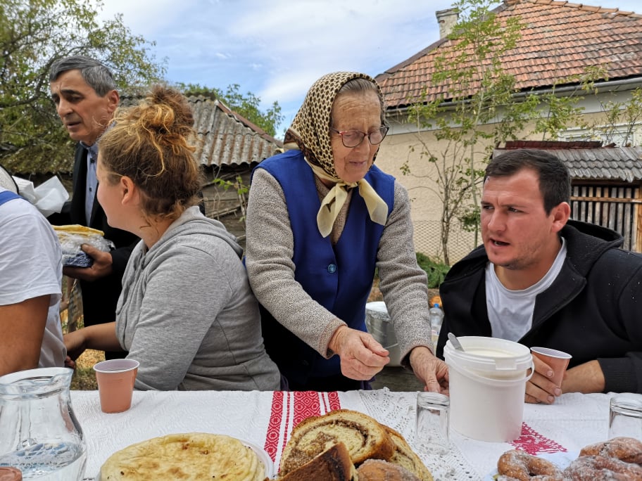 “Haidaț’, vă rog să serviți, uite un pic de groștior de bivol. Nu-i de la mine, noi nu mai avem în sat. Îmi aduce cineva. Noi avem văcuță. Toată mâncarea o gătăm cu smântână. Nu-i păcat altfel?”