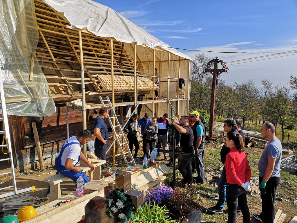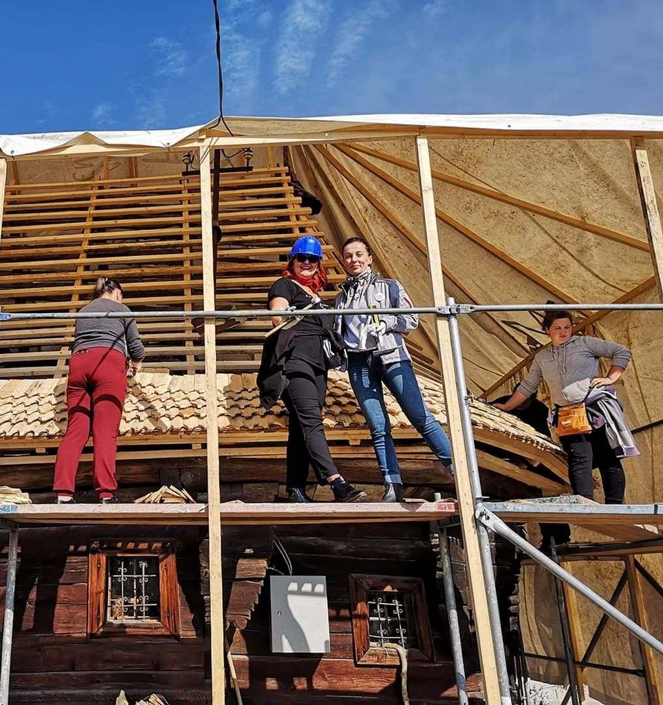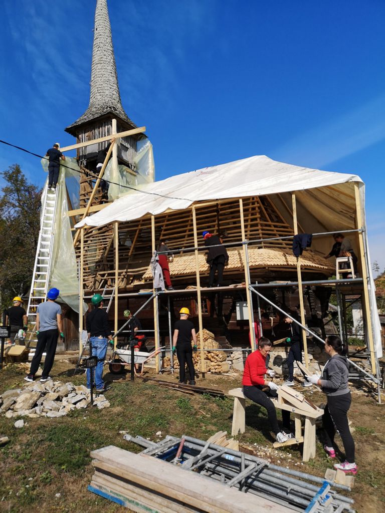 Sus, pe schela din spate, e deja Doina Cociș, directorul Direcției Județene de Patrimoniu, alături de câțiva copii de la Liceul Ortodox din Zalău. Bat de zor dranița/șindrila, sub atenta observație a meșterilor. Doina e convinsă că într-o viață anterioară a fost tâmplar… Camelia, colega noastră, preia calul și are să rânduiască până la finalul zilei aproape 500 de bucăți de șindrilă, pe care le vom bate noi, restul voluntarilor. Eu am bătut deja 6 bucăți. Și mi-e plină inima de bucurie. Până nu pui mâna pe patrimoniu, efectiv, să-i simți pulsul, nu înțelegi complet nevoia aceasta de reconectare cu valorile autentice românești.