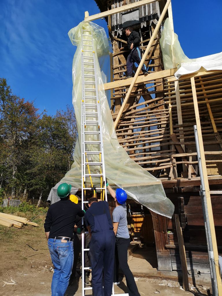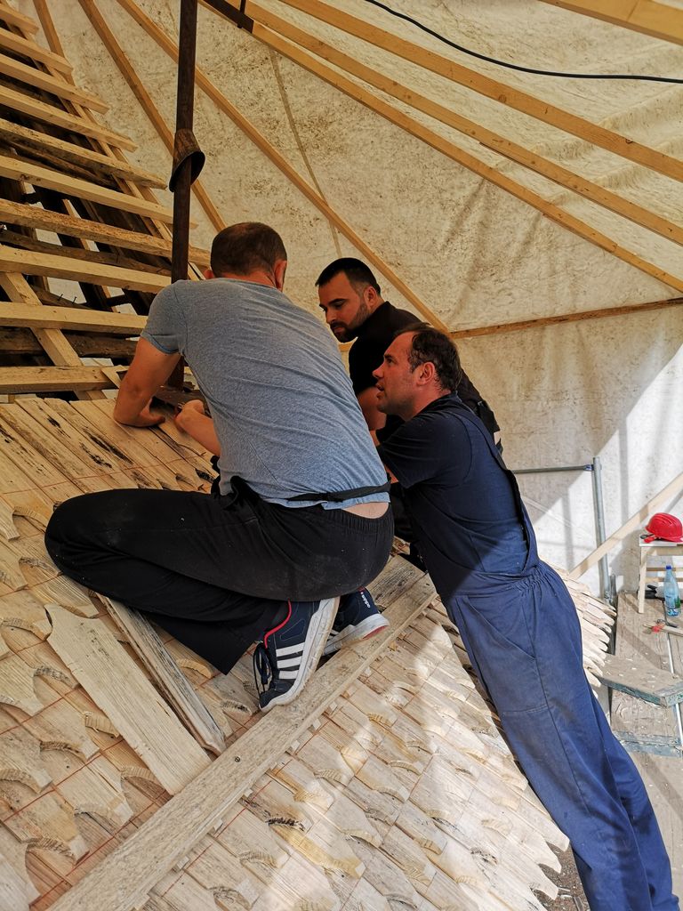 Câțiva bărbați, colegi de-ai mei harnici din Ro 100 Zalău, îl ajută pe Eugen să monteze schela pentru partea din față, cea cu turla. Noi, restul, ne organizăm pentru bătutul șindrilei.