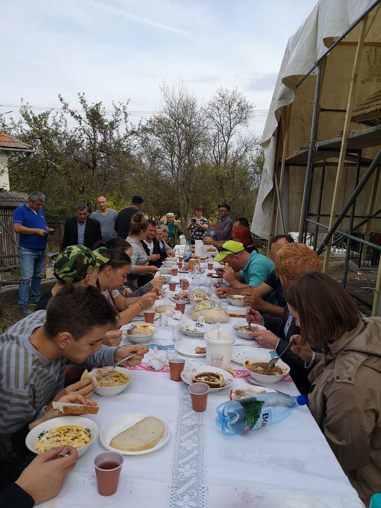 Oamenii s-au îmbrăcat frumos, unii chiar cu costum, ca de sărbători, și au venit să ne servească prânzul, ca la ei în sat! Se întind fețele de masă țesute în război: “Măi omule, frumos, să să vază cipca. Nu așe, lasă-mă pe mine, tulai Doamne iartă-mă că suntem lângă beserică!” După ce se așază toate bunătățile, se aude aceeași voce fermă: “de la fața asta de masă lipsesc doi ciucuri, ne facem de mândră minune la oamenii ăștia, dați jos tot să o întoarcem cu partea ailaltă la margine!” Toată lumea se conformează. Ajunge și primarul cu mult lăudata ciorbă de perișoare și cu oala de sarmale! Ne stârnește o poftă nebună. Ne așezăm la masă și se constată, official, că n-avem farfurii și tacâmuri. Primarul zice că a primit “comandă de mâncare și atât”, sătenii că s-au gândit că nu vine cu ciorba fără farfurii. Ne amuzăm cu toții și așteptăm până dă o fugă domnul Culiță, liderul informal al comunității, să rezolve problema. În timpul ăsta povestim: