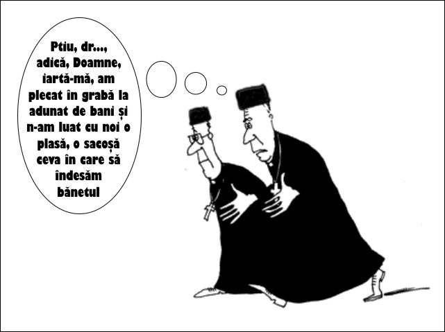 Străduţele cartierelor au început să fie bîntuite de apariţii negre sutănoase, care bat din uşă-n uşă pentru sfinţirea locuinţelor. Operaţiune sfîntă ce se execută, de altfel, în fiecare an, pentru că se pare că sfinţirea respectivă are termen de garanţie doar un an, după care nu mai e valabilă şi trebe reînnoită. Afacere sănătoasă, mon chere, ce să zic, mai ales că din tri vorbe de Doamne ajută, halatele se aleg cu cîte o bancnotă de la 50 de lei în sus. Sfinţeşti un bloc de 20 de apartamente …mno, faceţi şi voi un calcul. Câştiguri uşoare şi neimpozabile, ca într-o reclamă. Mai ales în acest sezon cam mort, în care bătrînii nu prea vor să moară, că de, e păcat de atîta voie bună, şi rămîn doar sinucigaşii, care nu au parte de cele lumeşti, pentru a trece la cele nelumeşti. Nici prea multe botezuri nu mai sînt, mai nou, că unii au început să şi gîndească cu organele, iar pentru nunţi e prea frig în căminurile coltorale.