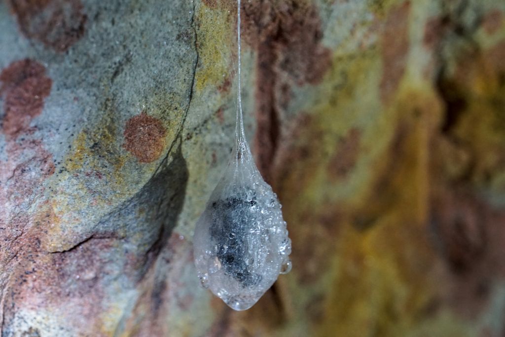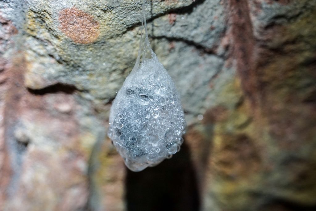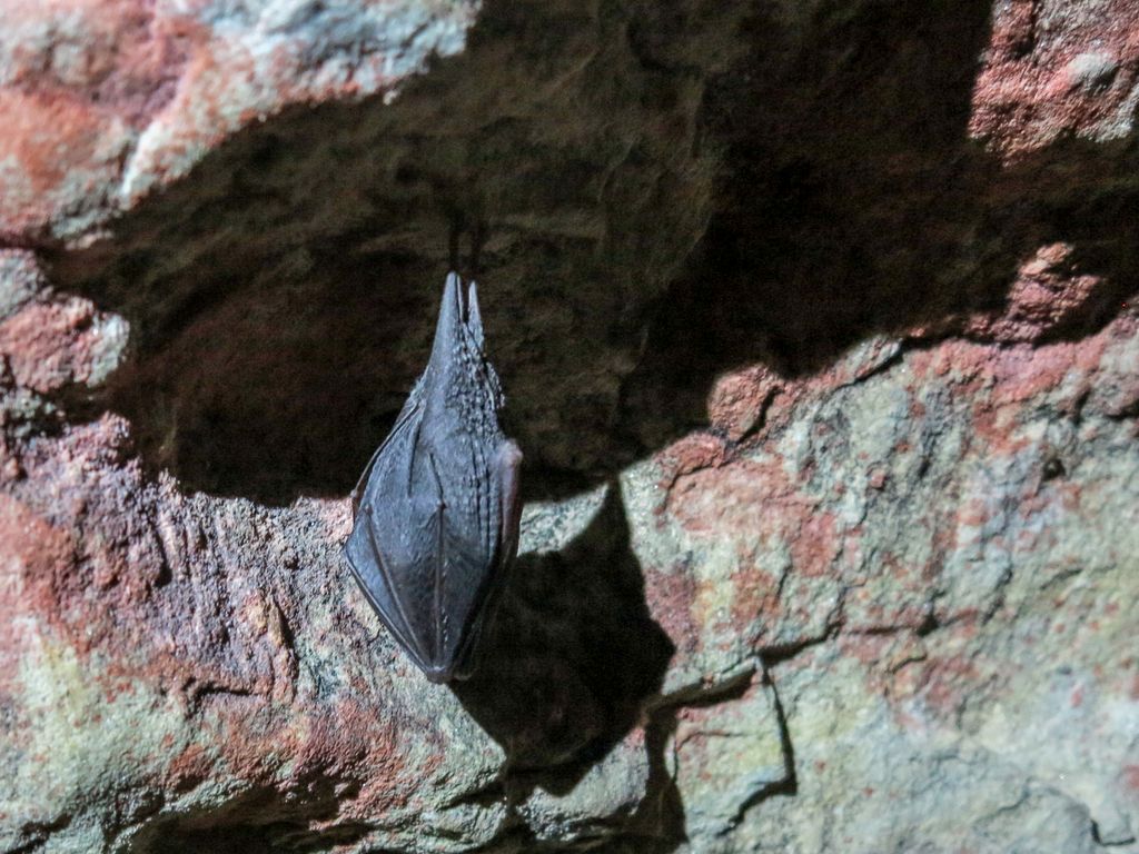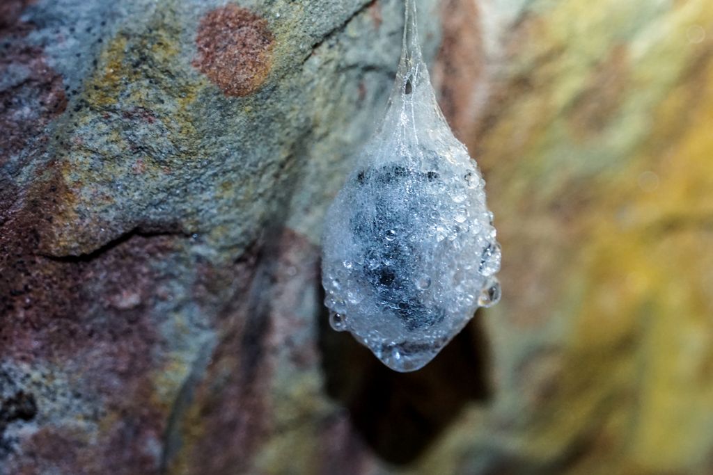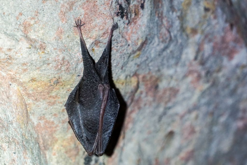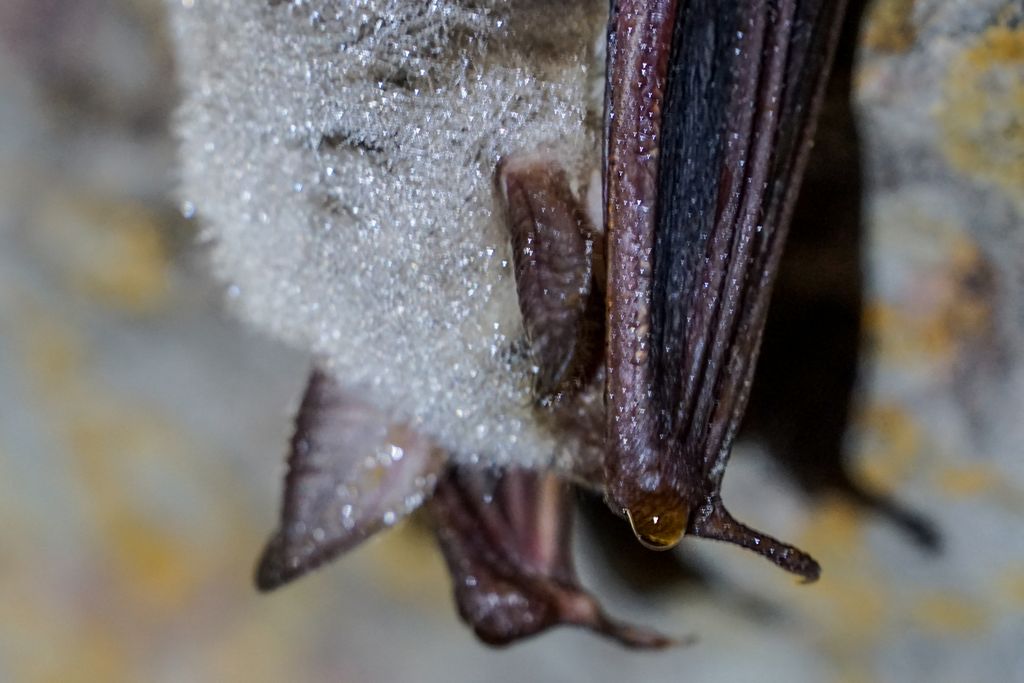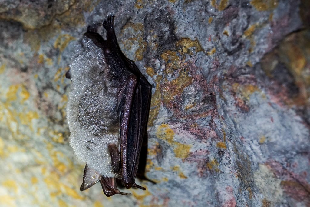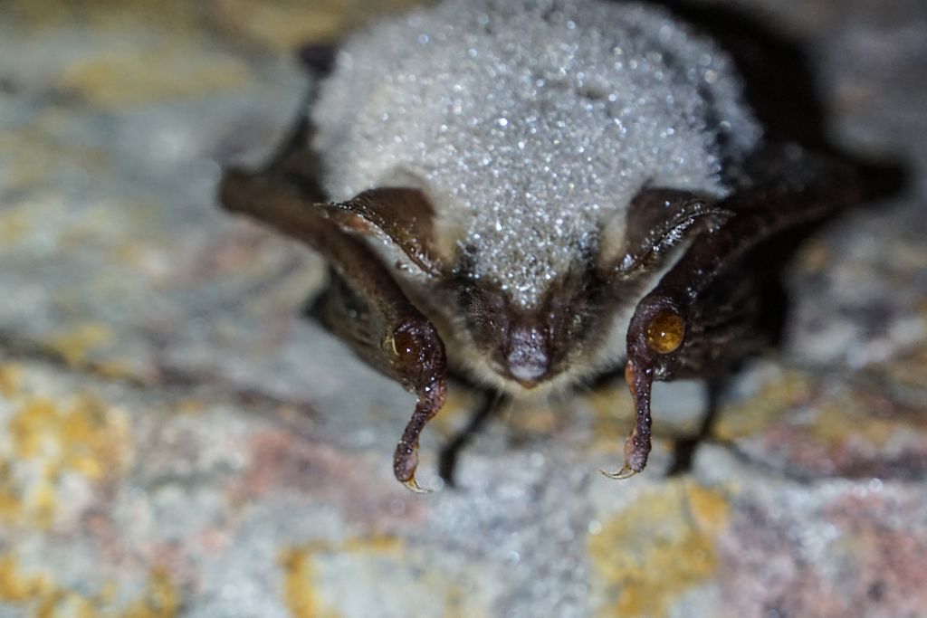 n-avea nicio treabă cu noi. Nici cu lumina lanternelor noastre. La fel nici ceilalți câțiva lilieci mai mici, dar neacoperiți de condens înghețat, semn că s-au trezit de ceva vreme. Stăteau atârnați cu capul în jos, nemișcați. Evident că nu ne-am putut abține de la a le face niște poze, e și ăsta un mod de a te apropia mai tare de vietățile ăstea fascinante. Atâta tot că e greu să focalizezi cum trebuie fără a avea lumina adecvată, însă o poză, două, hai trei, tot am reușit să facem.