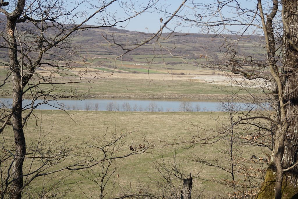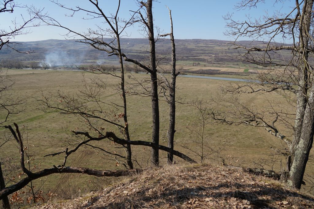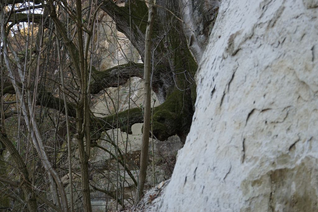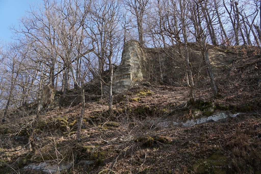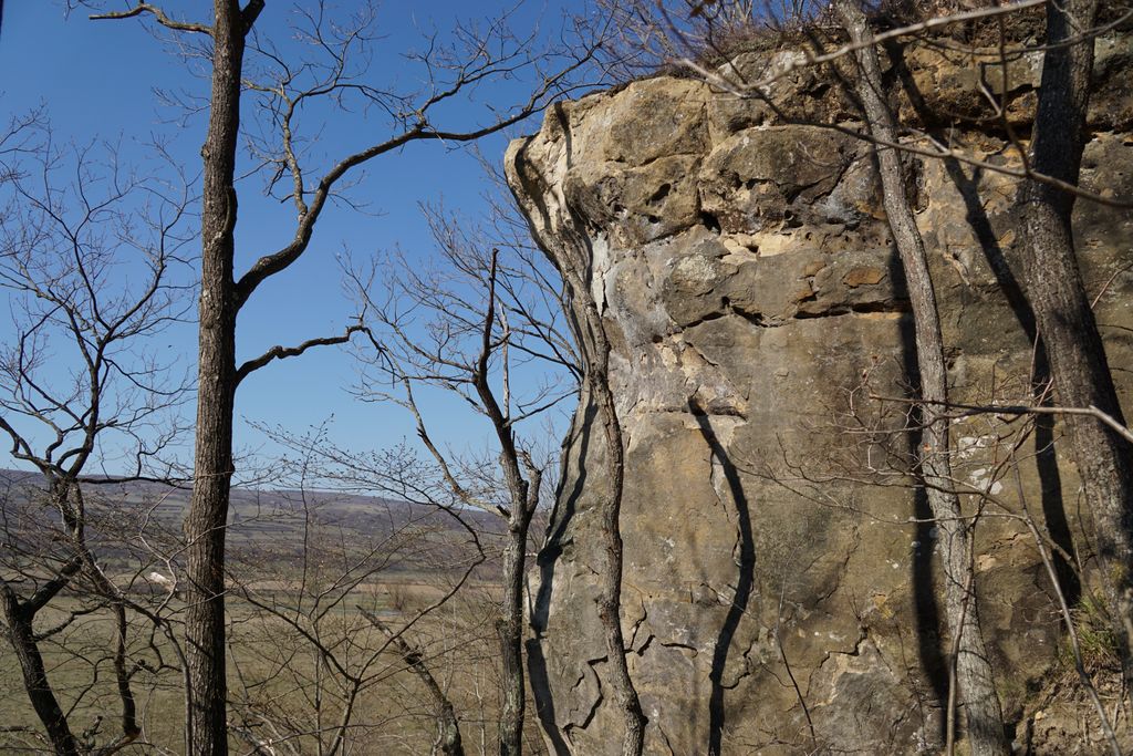 Am găsit, nu după foarte mult timp, ceea ce ni s-a părut a fi intrarea pe care o căutam. Adică, am calculat cam care ar fi distanța față de marginea stâncii și locul pe unde am urcat, și am ajuns într-un loc unde se vedea (ori așa părea) că a fost un fel capăt al tunelului de dedesubt, doar că, acum, colmatat. Ori astupat intenționat. Și pe bună dreptate, orice cădere de la înălțimea aia în golul de sub picioare ar fi mortală. Și pentru oameni și pentru animale. Așa cred, că acela e locul. Deși, acum, privind la pozele făcute, parcă am fost puțin prea departe de marginea stâncii. Dar, ce contează, oricum am fi găsit un loc exact ca cel pe care l-am găsit deja. Nimic ieșit din comun. Pădurea, priveliștea, stânca, astea, da, foarte frumoase. A adevărată încântare. Și am fi lungit escapada în pădurea de acolo, dar timpul s-a scurs mult mai repede decât am fi vrut.
