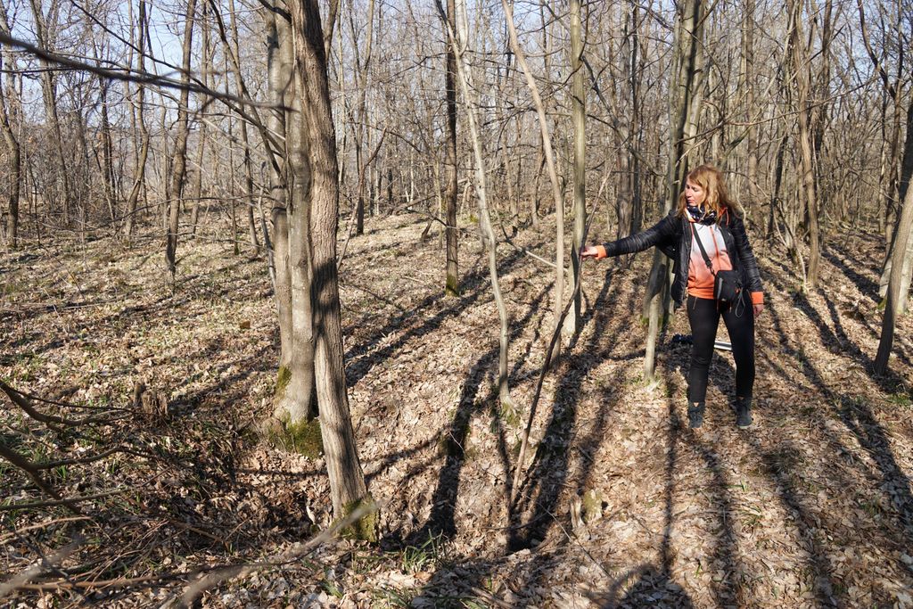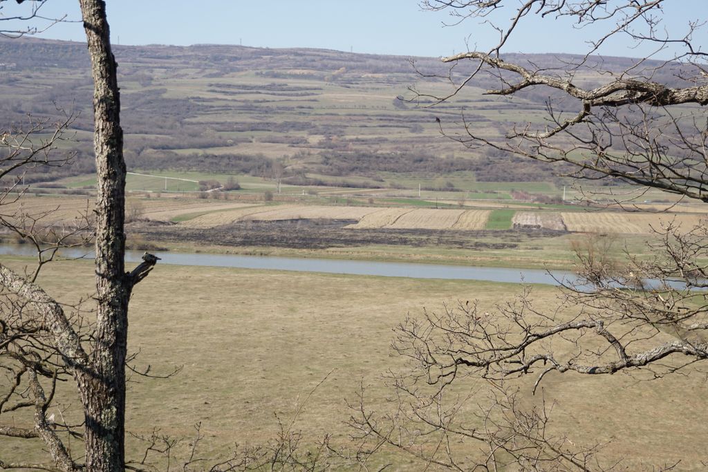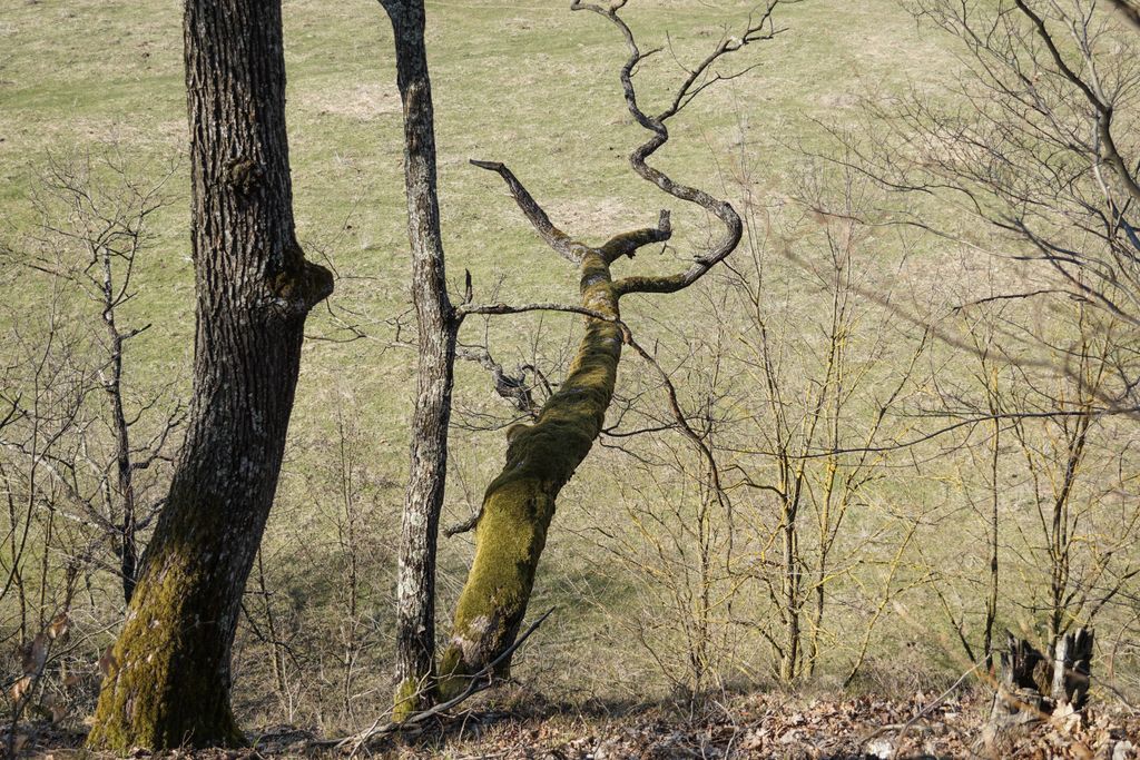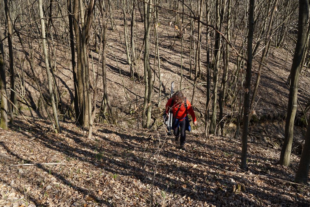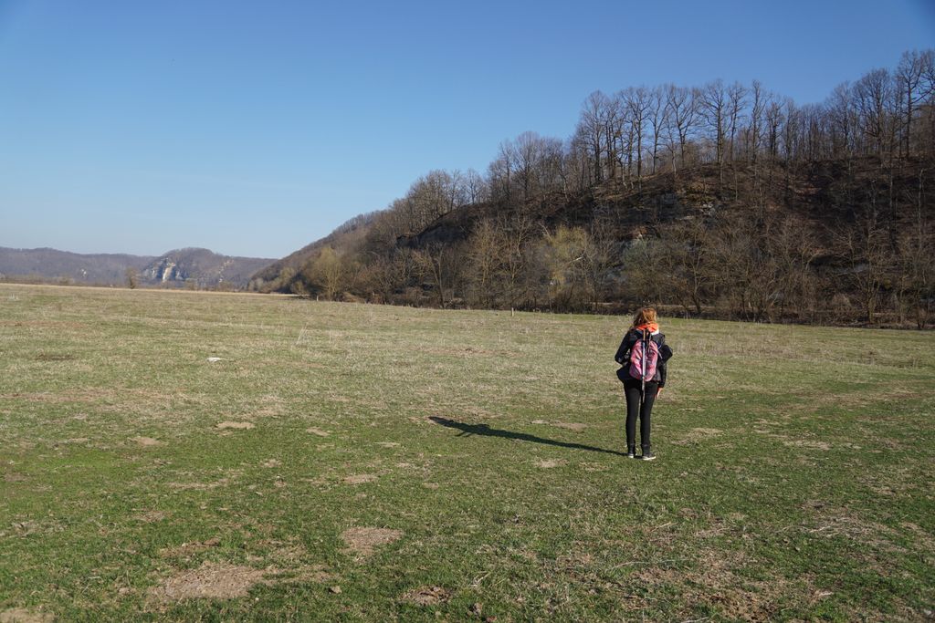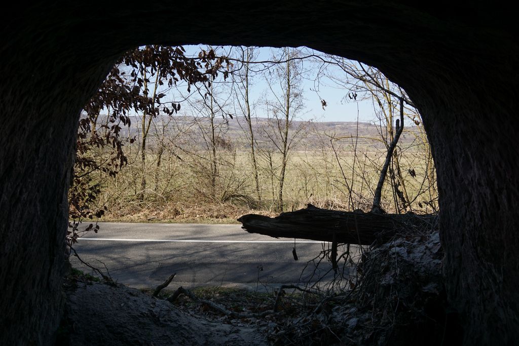 Am găsit, nu după foarte mult timp, ceea ce ni s-a părut a fi intrarea pe care o căutam. Adică, am calculat cam care ar fi distanța față de marginea stâncii și locul pe unde am urcat, și am ajuns într-un loc unde se vedea (ori așa părea) că a fost un fel capăt al tunelului de dedesubt, doar că, acum, colmatat. Ori astupat intenționat. Și pe bună dreptate, orice cădere de la înălțimea aia în golul de sub picioare ar fi mortală. Și pentru oameni și pentru animale. Așa cred, că acela e locul. Deși, acum, privind la pozele făcute, parcă am fost puțin prea departe de marginea stâncii. Dar, ce contează, oricum am fi găsit un loc exact ca cel pe care l-am găsit deja. Nimic ieșit din comun. Pădurea, priveliștea, stânca, astea, da, foarte frumoase. A adevărată încântare. Și am fi lungit escapada în pădurea de acolo, dar timpul s-a scurs mult mai repede decât am fi vrut.