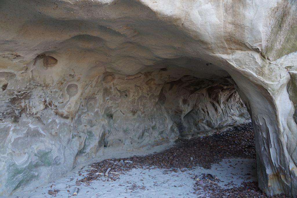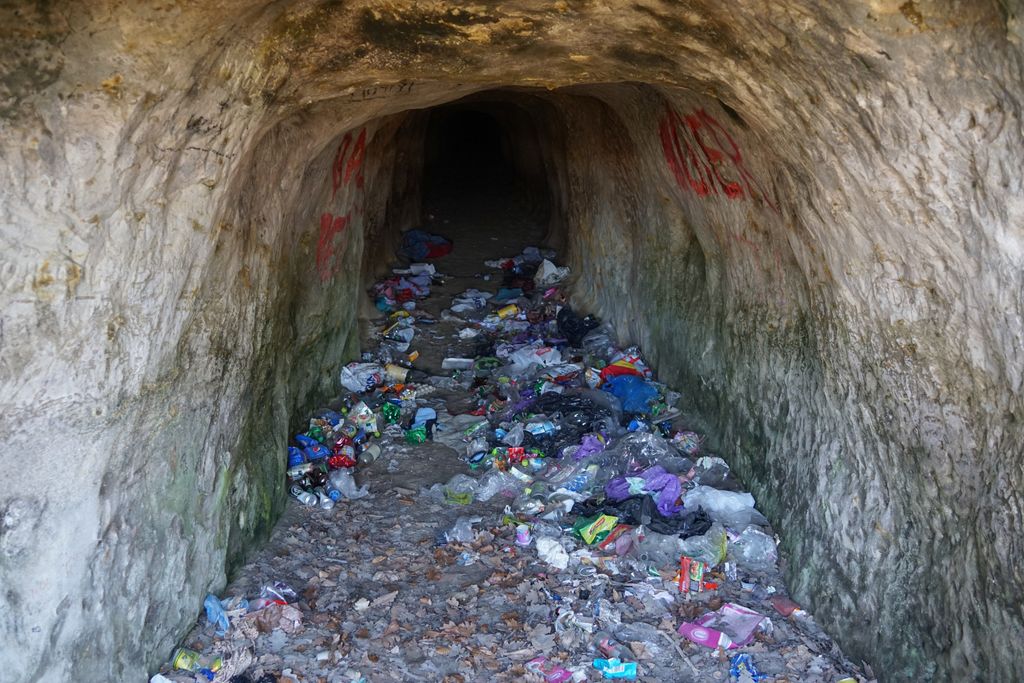 De fapt, am dat să intrăm în mină, sau în ce-o fi, dar ne-am oprit la intrare. De ce? Pentru că nesimțirea unora e un obstacol cam pe oriunde te-ai afla în țara asta foarte frumoasă, dar plină de gunoaie. La fel și aici. Vreo șapte metri de gunoaie stau de strajă la intrarea în tunelul săpat în gresie.