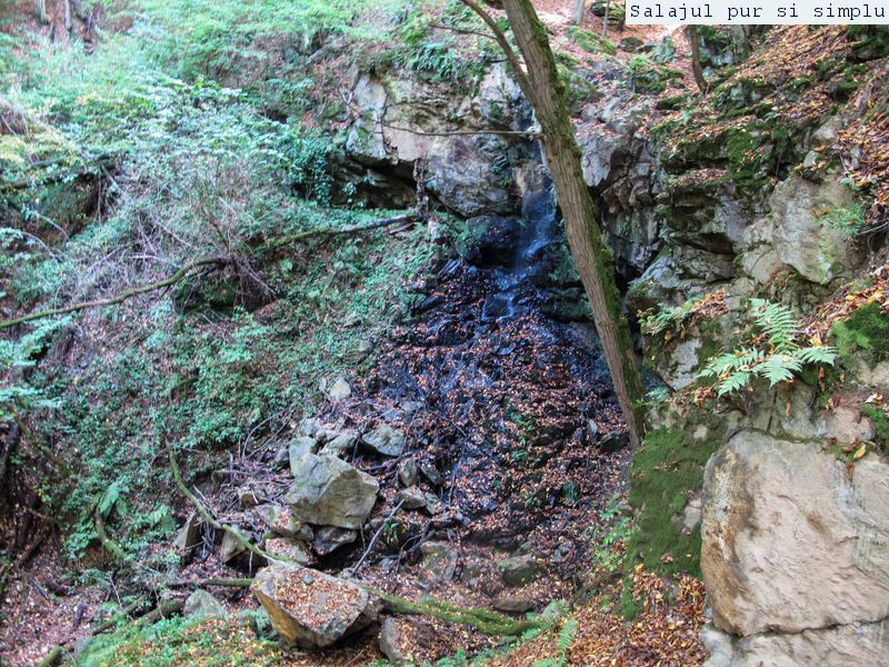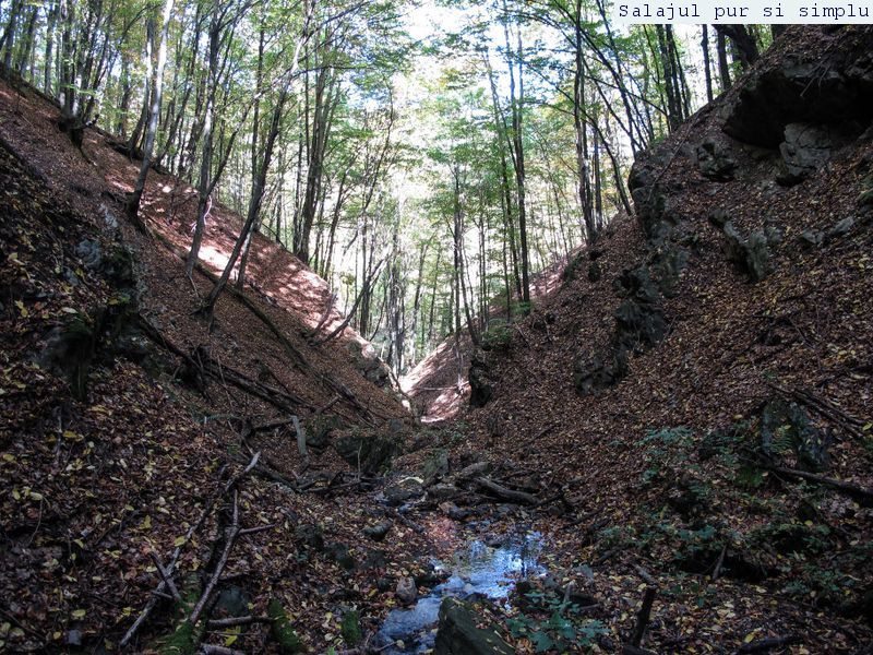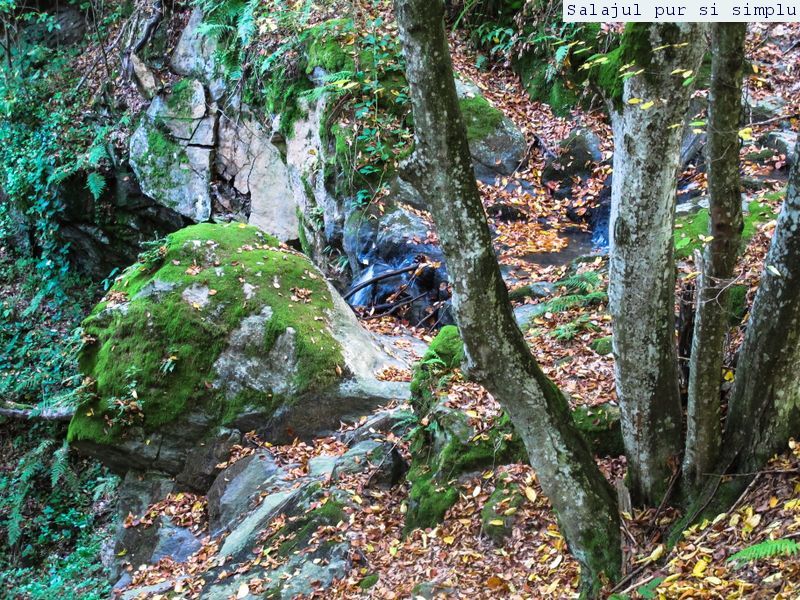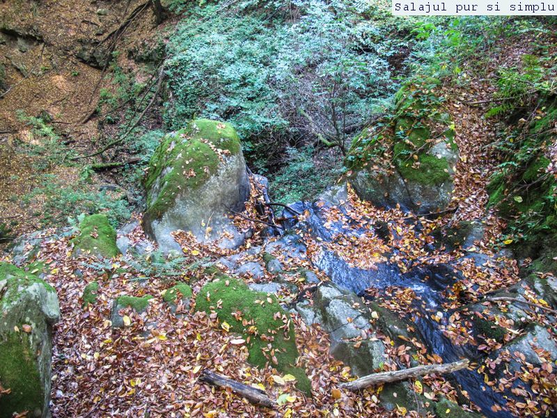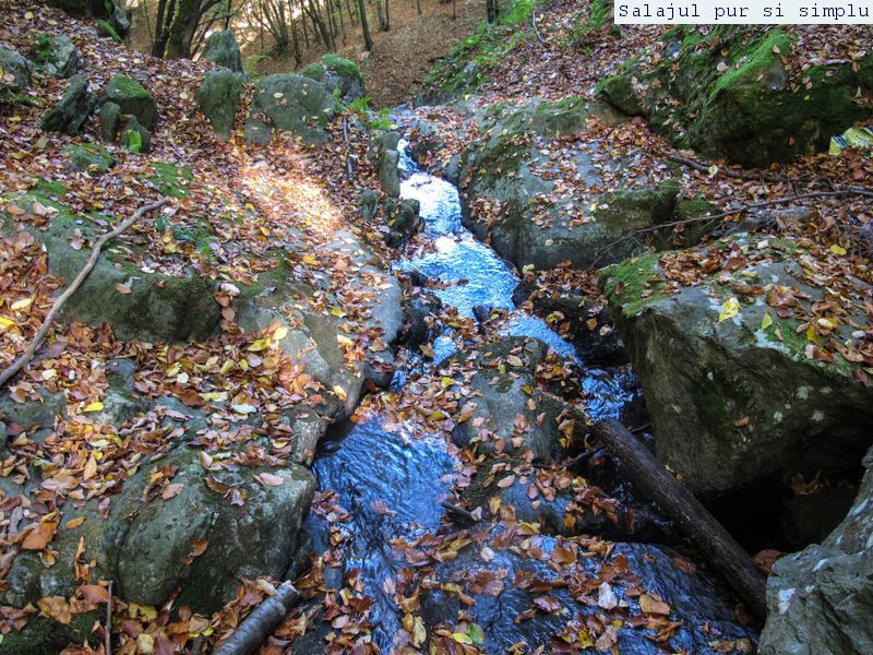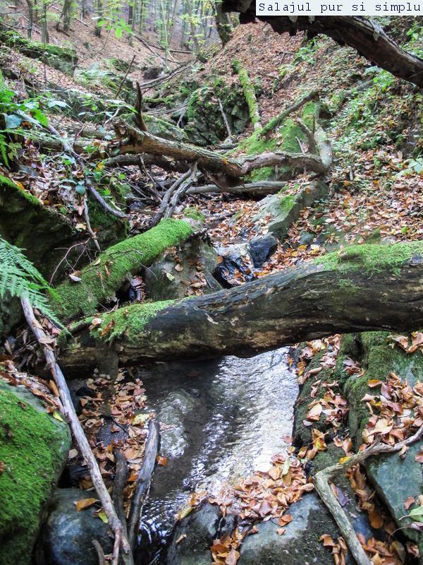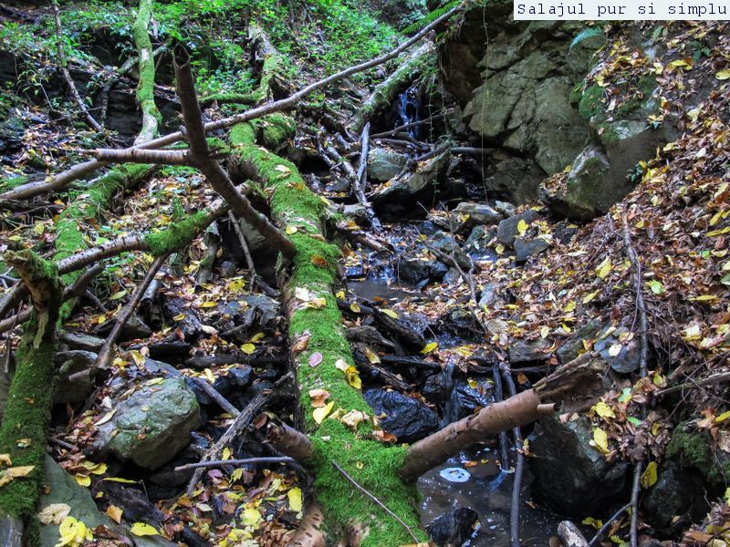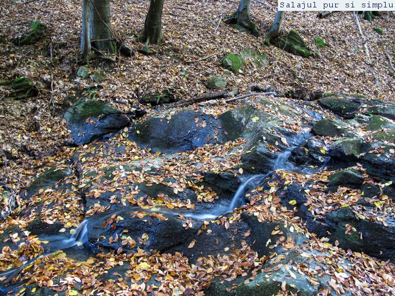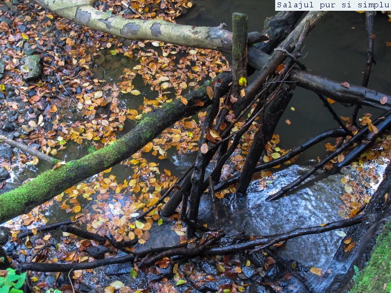 Am intrat în pădure răsuflând ușurat, și, încet, fără să mă grăbesc, fiindcă oricum nu e foarte mult de mers, am urmat firul văii, în amonte, pășind pe covorul portocaliu închis al toamnei. În stânga, pe firul văii, mici baraje de apă, unele foarte vechi, ori cel puțin așa par, stau de-a curmezișul, oprind cursul firesc al văii, dar natura a început să ia înapoi ce e al ei, așa că nu strică foarte tare peisajul. Și tocmai când mă întrebam la ce foloseau ălea, dau cu ochii de un baraj ceva mai nou, din care ieșea o conductă, cu un robinet mare. “Ahaaa, deci de aici se alimentează satul cu apă,” îmi răspund singur. Și pentru că am ajuns în locul unde valea se bifurca, am urmat cursul de apă din partea stângă , acolo unde, la vreo 100 de metri depărtare, se vedeau stânci.