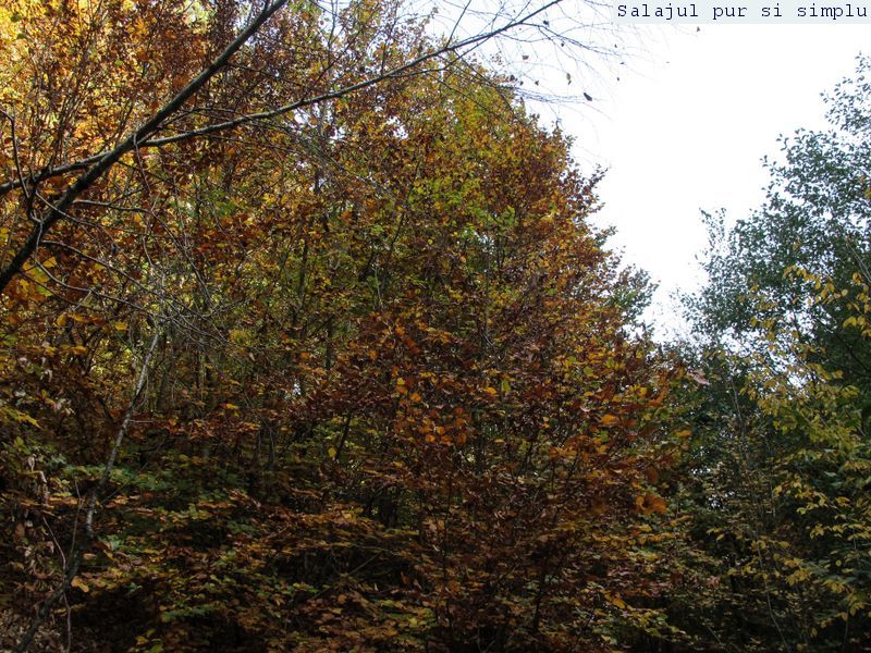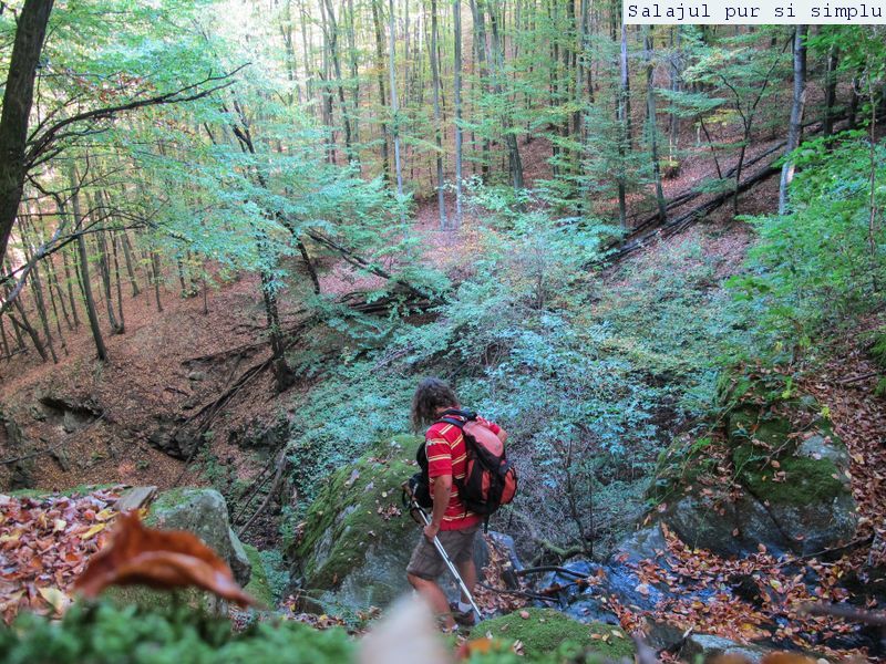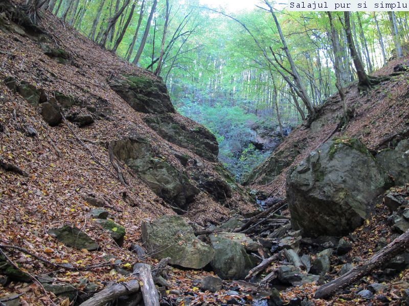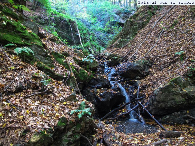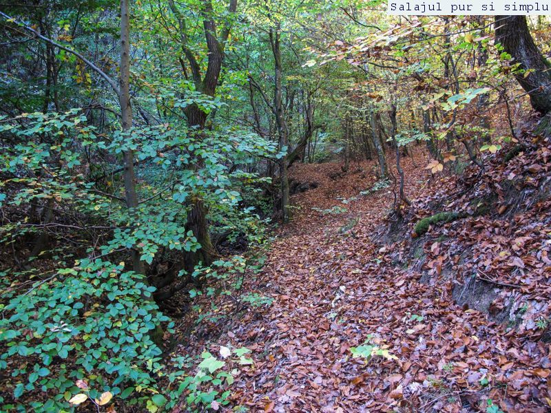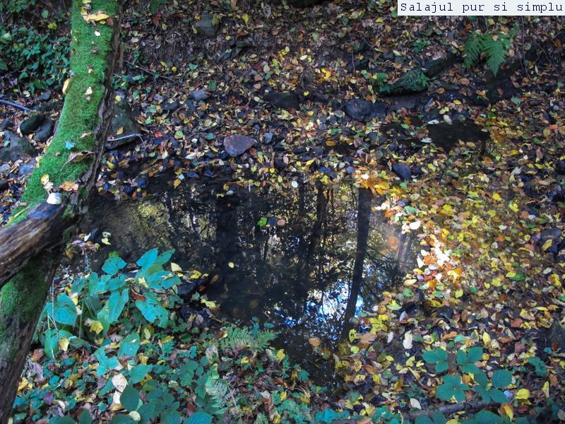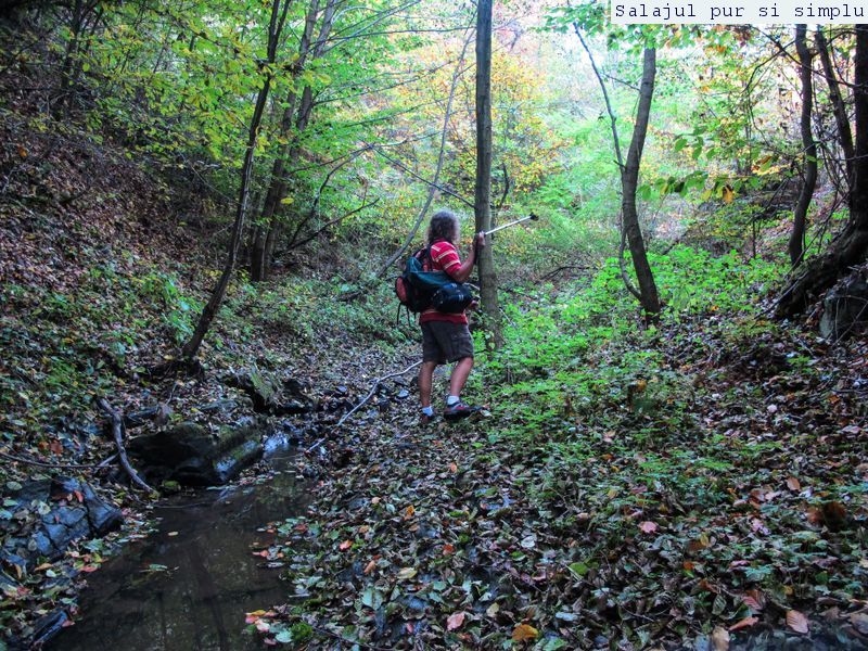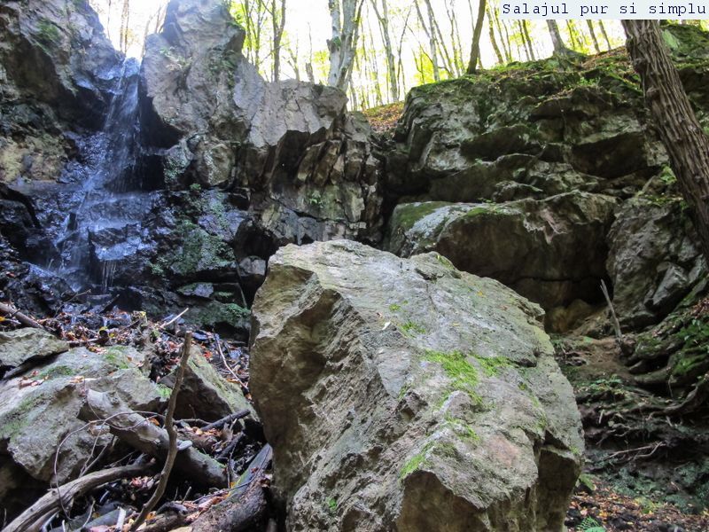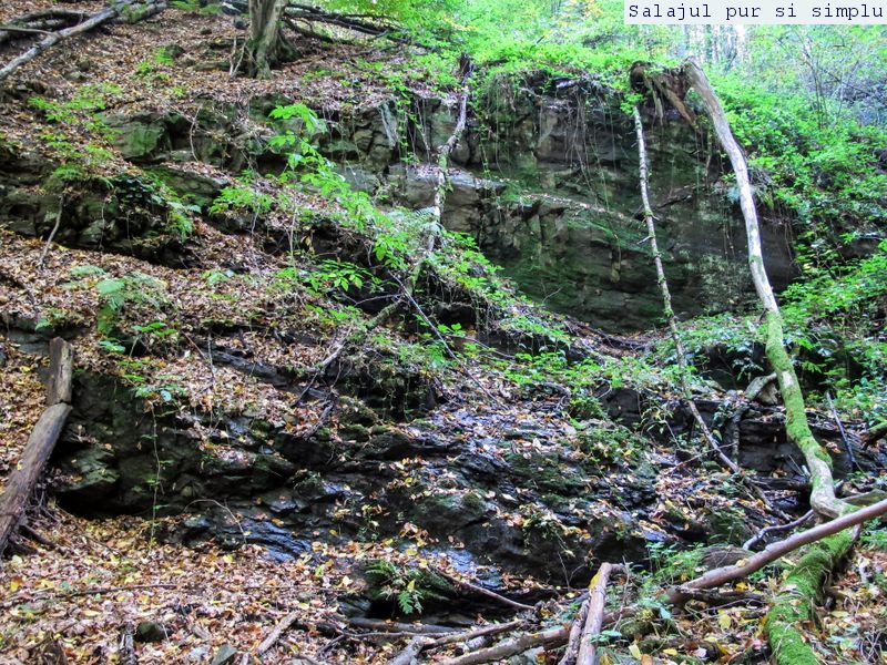 Am intrat în pădure răsuflând ușurat, și, încet, fără să mă grăbesc, fiindcă oricum nu e foarte mult de mers, am urmat firul văii, în amonte, pășind pe covorul portocaliu închis al toamnei. În stânga, pe firul văii, mici baraje de apă, unele foarte vechi, ori cel puțin așa par, stau de-a curmezișul, oprind cursul firesc al văii, dar natura a început să ia înapoi ce e al ei, așa că nu strică foarte tare peisajul. Și tocmai când mă întrebam la ce foloseau ălea, dau cu ochii de un baraj ceva mai nou, din care ieșea o conductă, cu un robinet mare. “Ahaaa, deci de aici se alimentează satul cu apă,” îmi răspund singur. Și pentru că am ajuns în locul unde valea se bifurca, am urmat cursul de apă din partea stângă , acolo unde, la vreo 100 de metri depărtare, se vedeau stânci.