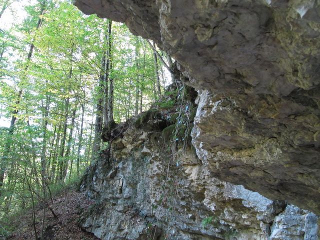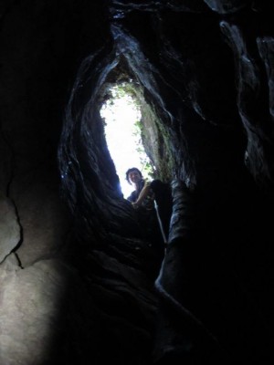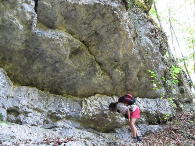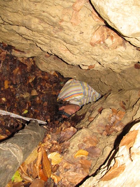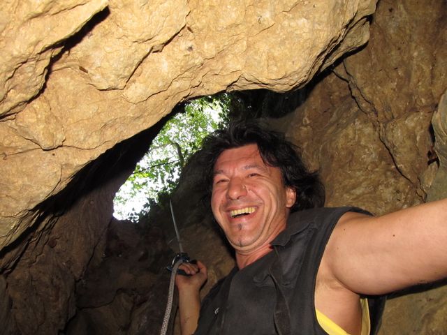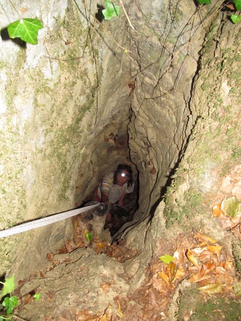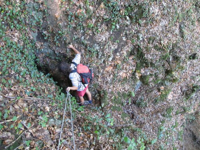Doar după ce am ajuns deasupra săritoarei ne dăm seama de cât de înalt şi abrupt e locul. Oricum, când te caţeri te foloseşti de orice rădăcină, creangă sau copăcel, ce-ţi iese în cale. Suntem aproape siguri că hornul e undeva spre vârful săritoarei, intrarea în peşteră nu se vede încă, dar noi deja o simţim. Imposibil de coborât spre balconaşele săritoarei, fără asigurare. Cea mai mică alunecare te-ar angaja într-o cădere liberă de cel puţin 15 metri şi chiar nu dorim, acum, o astfel de experienţă. Aşa că, Călin scoate o coardă de 20 de metri din rucsac, pe care o înfăşurăm după un copac ce pare destul de sănătos şi ne dăm drumul spre balconaşul de pe săritoare.