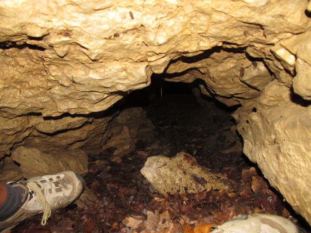 Ne echipăm complet cu rucsacii care conţin corzi, hamuri, carabine şi alte jucării specifice muntelui, dar şi minimul necesar unei supravieţuiri în caz de ceva. Urmăm albia secată a pârâului, presărată cu bolovani destul de mari, e bine că am venit amândoi cu bocanci. Cam 200 de metri ţine plimbarea pe firul secat al apei, moment în care nu ai cum să ratezi locul cu pricina, dat fiind că în faţa ta se deschide o săritoare destul de înaltă – cam de 15 metri, cu două balconaşe, cel superior fiind locul de acces în peşteră. Zona este abruptă, iar accesul spre partea superioară se poate face doar înconjurând săritoarea şi urcând povârnişul. Solul este complet mascat de un covor gros de frunze, aşa că fiecare pas trebuie făcut cu grijă, dacă ai de gând să rămâi întreg.