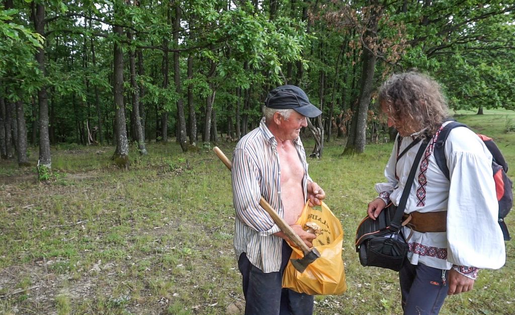 L-am întrebat ce face pe acolo. Pintea m-a privit direct, așa cum o fac oamenii simpli de la țară, și, chiar dacă nu și-a dat drumul la vorbe, l-am auzit: ”Io? Api io ce fac p-aci? Nu tu, îmbrăcat așe cum ești îmbrăcat? Tu ce faci pe aci. Nu io.” Am dat-o întoarsă, și l-am întrebat dacă a venit după hribe, că văd că are o plasă plină. Punct ochit, punct lovit. Omul și-a schimbat, din nou, căutătura din privire: ”Hăă, atâtie vin p-aici, pă undie-s curmăturile ăstea die porci. Atâtie sînt de numa!”. Ținând toporul pe post de indicator îmi tot arăta pe unde se fac hribele, pe la marginea pădurii, acolo pe unde tot vin mistreții. Și în timp ce-mi spunea una, alta, mai arunca câte o privire la cămașa mea țărănească. Adică, atunci când eu dădeam din gură de unul singur despre cât de faină-i cămașa asta, el era în spatele meu, nu foarte departe.