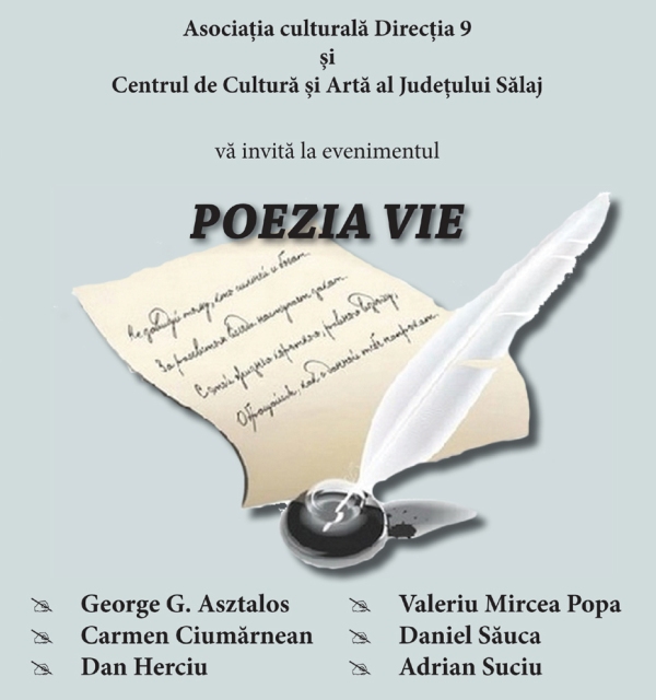 Evenimentul „Poezia vie“ va avea loc luni, 22 septembrie 2014, ora 18:00 în Sala „Dialoguri europene” de la Centrul de Cultură și Artă al Județului Sălaj, în organizarea Asociației culturale Direcția 9 și a Centrului de Cultură și Artă al Județului Sălaj. Cu această ocazie vor avea loc recitaluri de poezie, prezentări și lansări de carte a poeţilor George G. Asztalos, Carmen Ciumărnean, Dan Herciu, Valeriu Mircea Popa, Daniel Săuca şi Adrian Suciu.