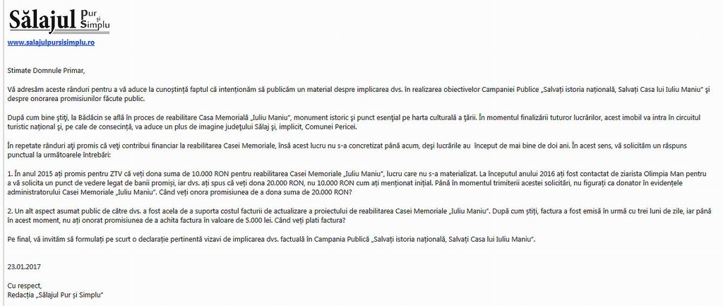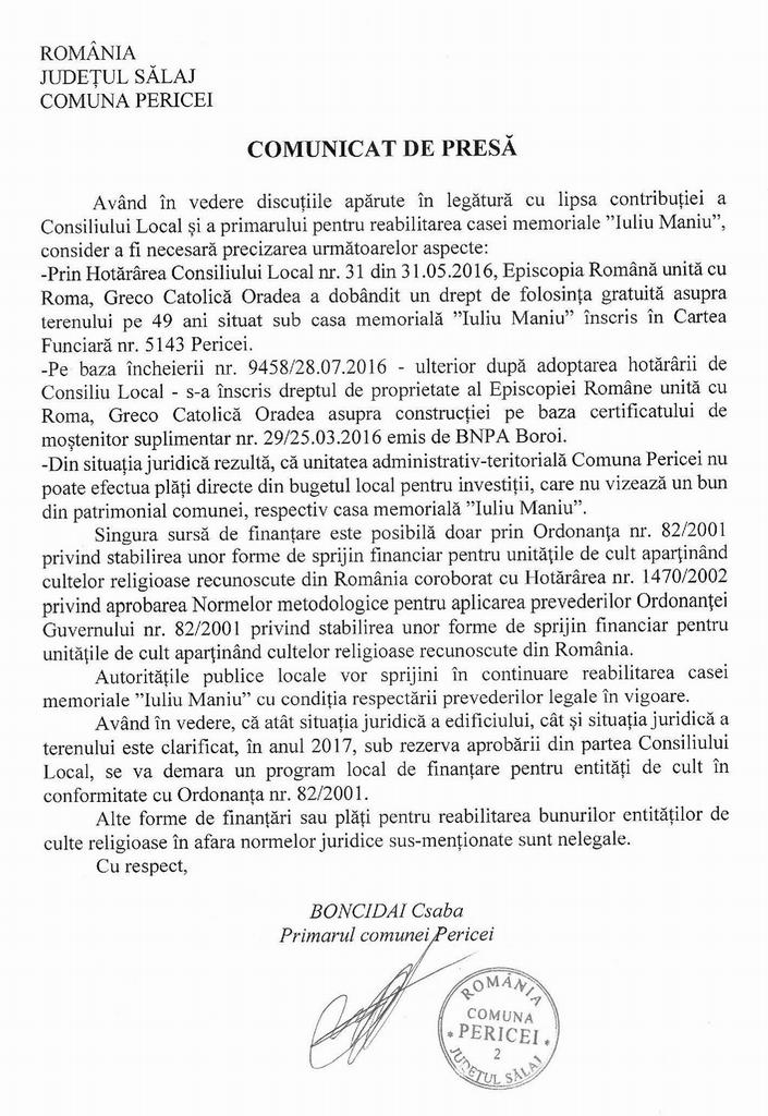 Așa se arată într-un răspuns al primarului Comunei Pericei, Boncidai Csaba, la solicitarea publicației „Sălajul Pur și Simplu” de a formula un punct de vedere pertinent legat de implicarea lui și a instituției în realizarea obiectivelor Campaniei Publice „Salvați Istoria Națională, Salvați Casa lui Iuliu Maniu”. În solicitarea noastră am dorit să obținem un răspuns care să justifice neonorarea promisiunilor făcute public, mai exact cea legată de achitarea facturii de actualizare a proiectului de reabilitare, în valoare de 5.000 de lei, și promisiunea de a dona 20.000 lei pentru lucrările demarate la casa lui Iuliu Maniu. Iată și un fragment din răspunsul formulat de edil: „Din situația juridică rezultă că unitatea adminitrativ-teritorială Comuna Pericei nu poate efectua plăți directe din bugetul local pentru investiții care nu vizează un bun din patrimoniul comunei, respectiv Casa Memorială „Iuliu Maniu”. Pe această cale, îi transmitem primarului că, spre exemplu, Primăria Șimleu Silvaniei a găsit modalitatea de a face o donație, chiar dacă imobilul de la Bădăcin nu se află în patrimoniul orașului Șimleu Silvaniei. Ba mai mult, primarul orașului Șimleu Silvaniei, Septimiu Țurcaș, a făcut și o donație în nume personal. Totodată, îi transmitem că Parohia Greco-Catolică a fost nevoită să achite factura de 5.000 de lei. Pe viitor, ar fi indicat să se verifice posibilitatea asumării unor promisiuni, înainte de a le face publice doar de dragul atragerii unui capital de imagine pozitiv, inclusiv asigurările de implicare transmise fostului premier al României, Dacian Cioloș.