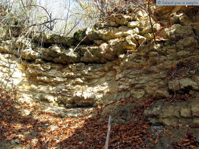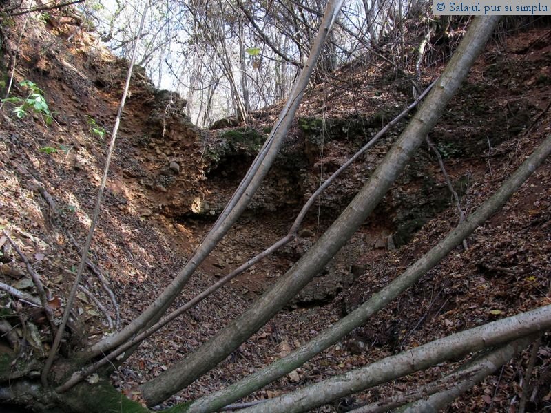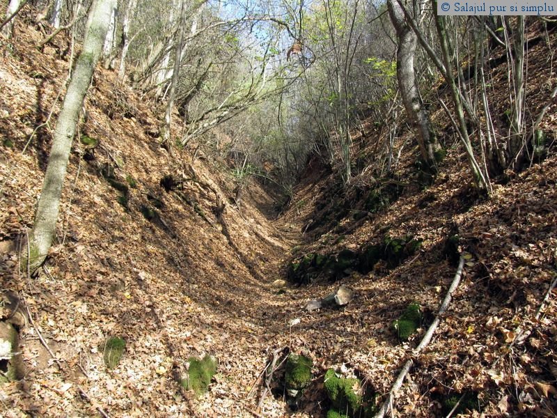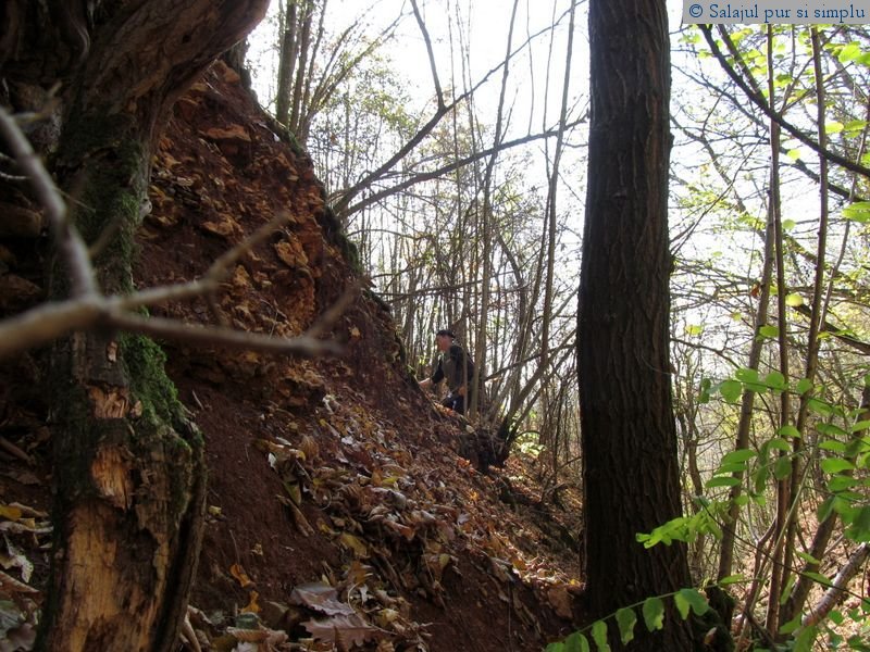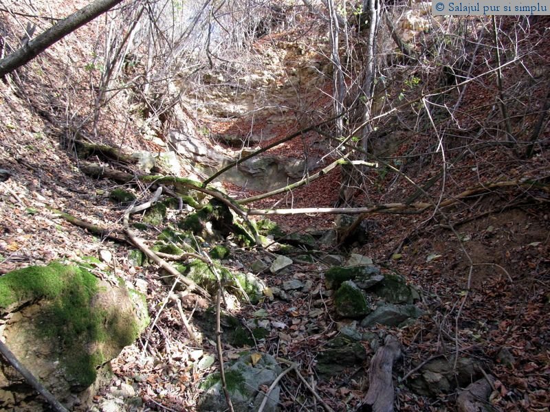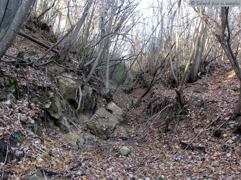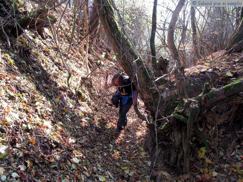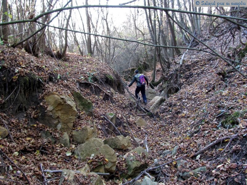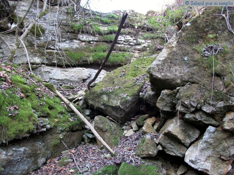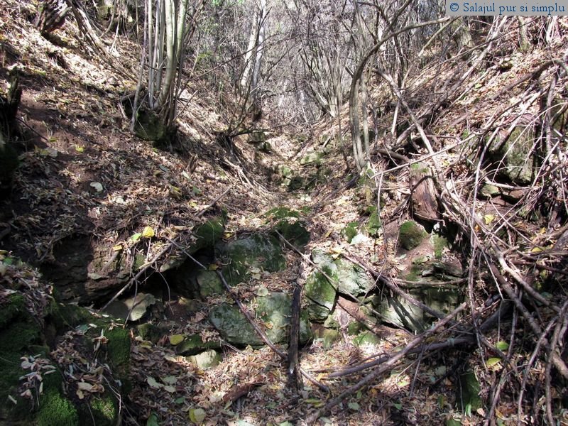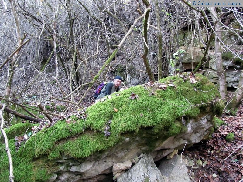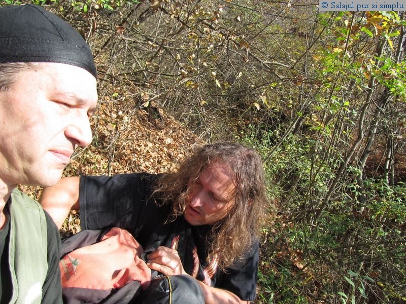 Cum am intrat pe cîmp, am și dat, mai încolo, de o vale, ne-am zis noi, băăăi, asta-i aia Scurtă, moment ne-am băgat în ea și am început urcușul. Nu după mult timp, au început să apară zonele calcaroase și chiar ne-am bucurat, că bănuiam că și dăm de peșteri. Apoi, valea s-a transformat în niște uimitoare săritoare, ca niște baraje, la început mai mici, după care se închidea cu un zid înalt de vreo 6 metri, imposibil de urcat. Calcarul se fărîmițează și chiar de pare ușurel de făcut – fiind în trepte, e chiar riscant. Așa că, n-avem decît să ieșim din vale, pe niște pereți de pămînt înalți de vreo 12 metri. Ici-colo cîte o rădăcină. Mărăciniș la greu. Urcă prima dată Călin și după cum îl aud că suduie și suflă la greu, îmi dau seama că ceva e în neregulă. Greu, ajunge pe buza văii și se pune în fund, înghițind lacom aer. „Mă, ceva e în neregulă. Efectiv am amețit. Nu mai am aer”, zice el. Instinctiv caut o altă ieșire și, deși pare un pic mai accesibilă, pînă ajung sus îs și eu buimac. Bem apă, încercăm să ne recăpătăm suflul, după care ne dăm seama că am ieșit pe partea stîngă și nu pe dreapta, încotro ar fi trebuit noi s-o luăm. Asta e. Valea continuă în sus și căutăm – deplasîndu-ne pe buza ei, să găsim un loc din care să coborîm înapoi în ea. E ceva acolo, nu știu, ori era ceva în aer, dar parcă ne mișcam tot mai greu. Bolovani imenși în vale, acoperiți cu mușchi, săritoare după săritoare, în formă de amvon, ba dăm și peste un șarpe de peste 1 metru lungime, negru, cu cap alb-galben, de grosimea unui deget, care, speriat, se unduiește rapid sub un trunchi de copac. Cred că a apucat Călin să-l filmeze.