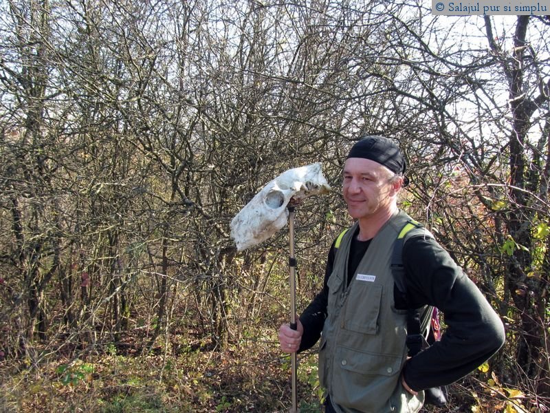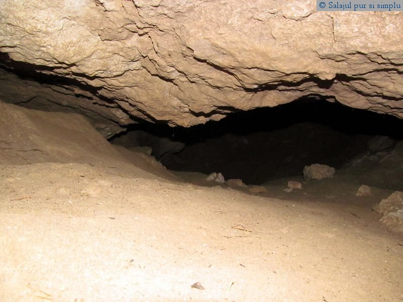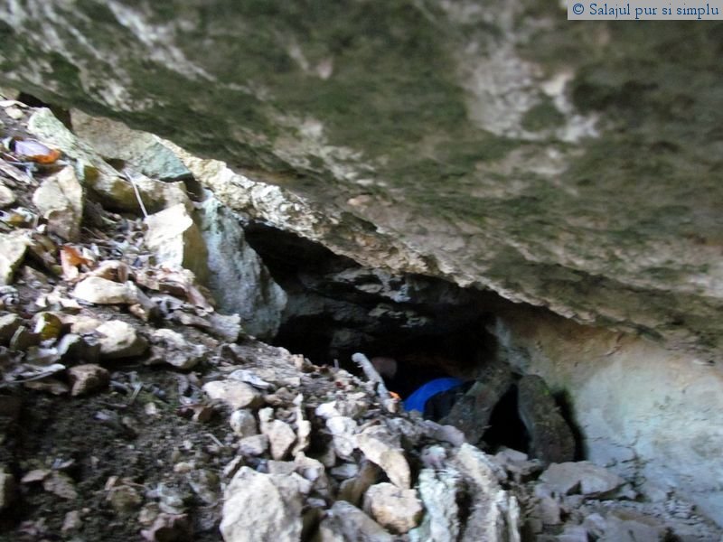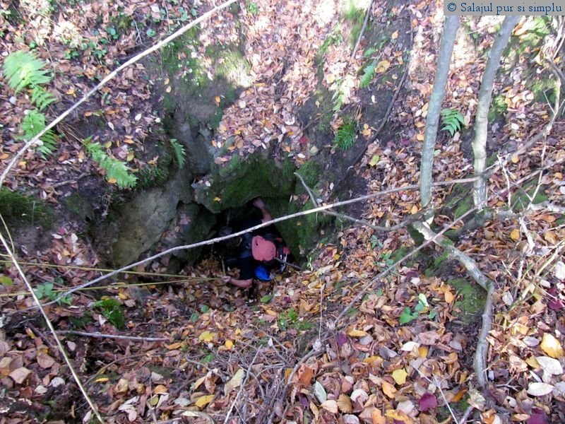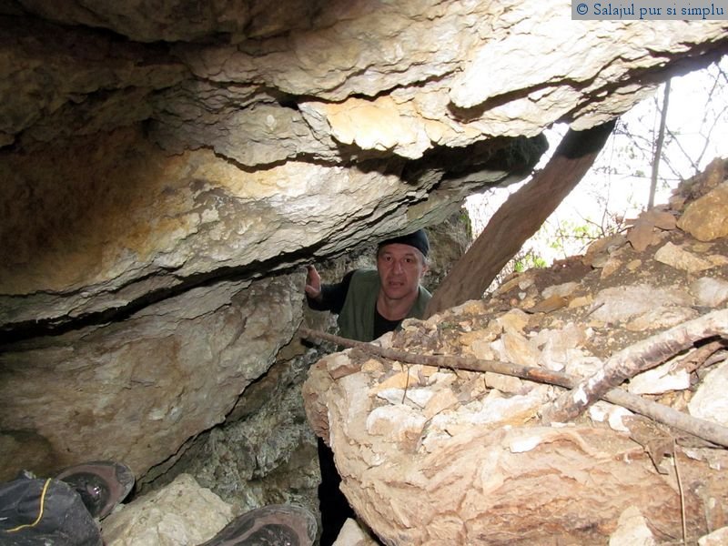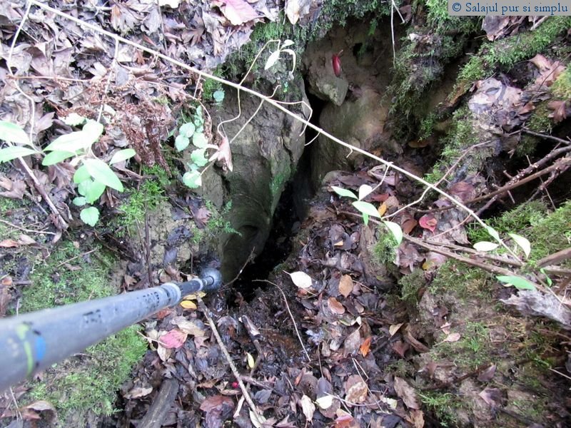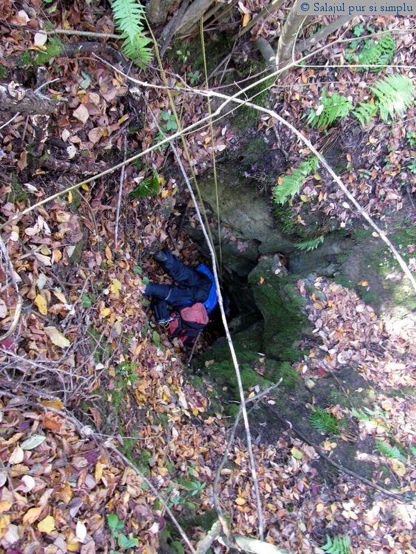 Apoi, după alte lupte cu scaii, intrînd în altă rîpă, dăm peste o gaură de peșteră, ce pare a fi cu intrare oblică. Un pic colmatată. Călin se leagă cu cordelina și coboară la ea și, ca să vadă ce-i înăuntru, intră cu capul înainte. Eu, de la buza rîpei, cu mîna pe cordelină, mă gîndeam cît de haios o să fie, cînd va încerca să iasă afară. De aia i-am zis, Peștera cu capul în jos. În fine, avenele astea nu există pe hartă. Nici peștera. Așa că, chiar putem spune că am descoperit ceva nou.
