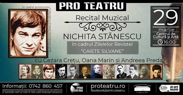 Actrițele Cezara Crețu, Oana Marin și Andreea Preda vor oferi un recital muzical, un omagiu adus marelui poet Nichita Stănescu, vineri, 29 martie 2019, la ora 16:00, la Centrul de Cultură și Artă Sălaj, sala “Dialoguri Europene”, în cadrul Zilelor Revistei “Caiete Silvane”.