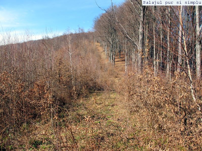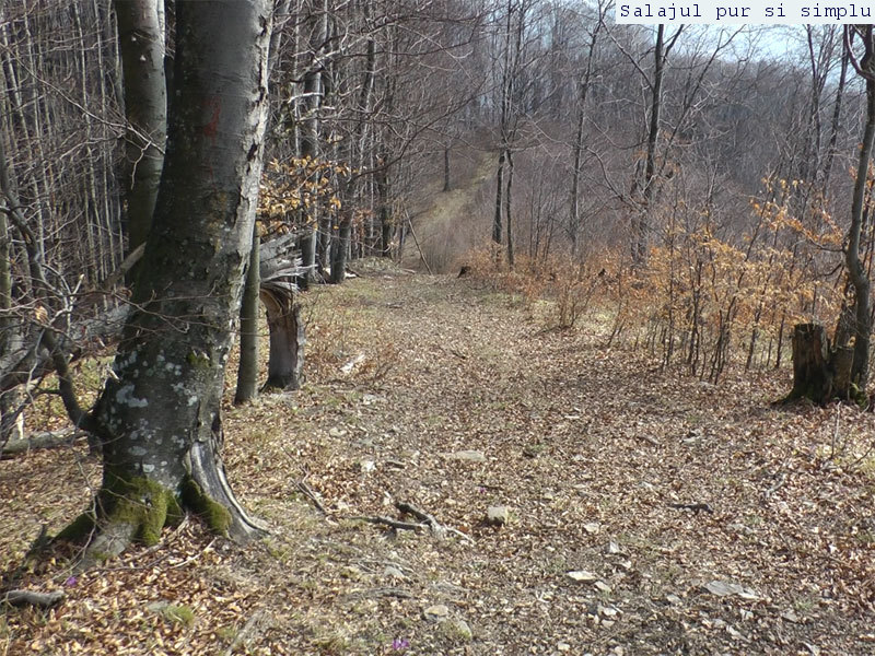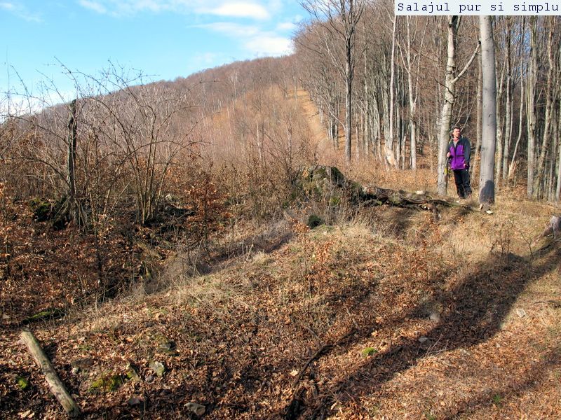 La un moment dat am părăsit drumul, pe undeva pe la 740 metri altitudine, și am luat-o direct spre culme, atacînd versantul destul de abrupt. E singura posibilitate pe care o ai, dat fiind că trebuie să ajungi pe culme, ca să te poți orienta. Și, chiar așa a fost, sus se putea vedea clar vîrful Măgura Priei, iar sub el, o altă culme, ciudată, dar care de departe dă impresia de punct de observație.