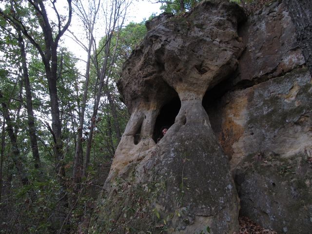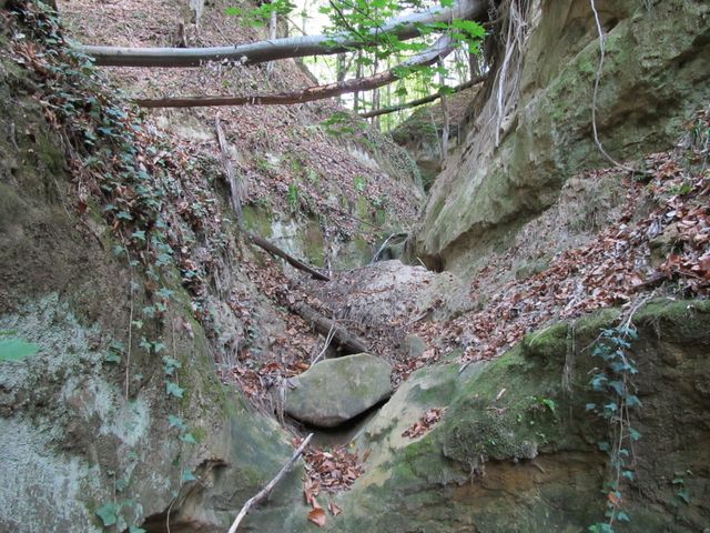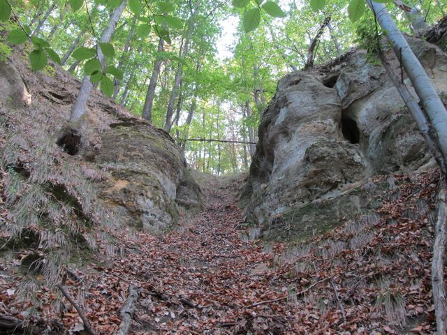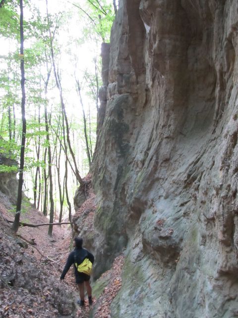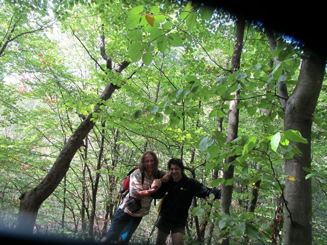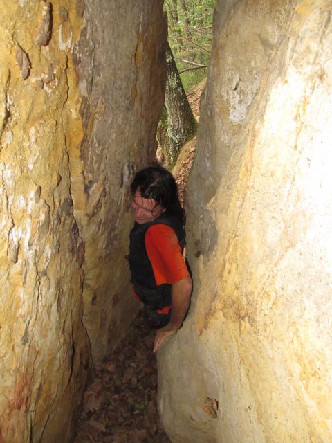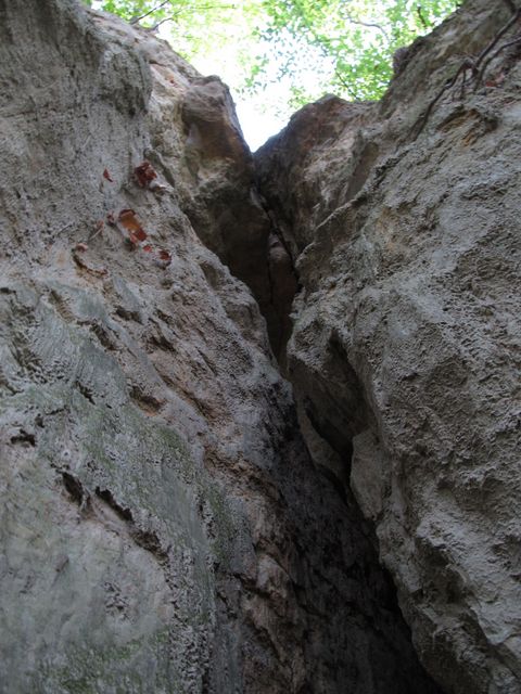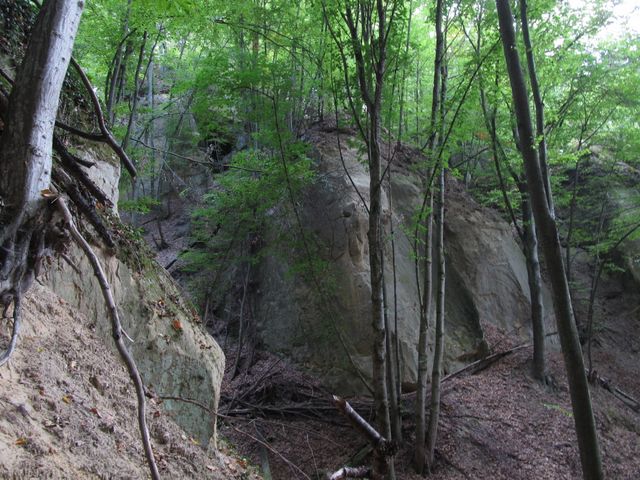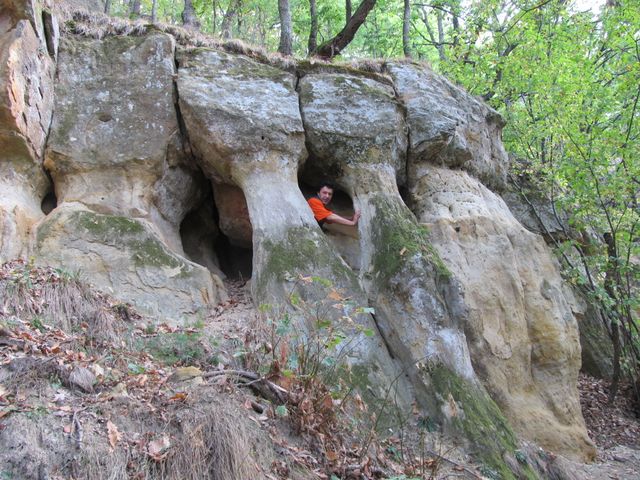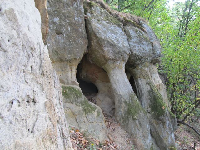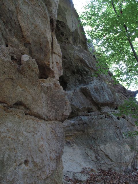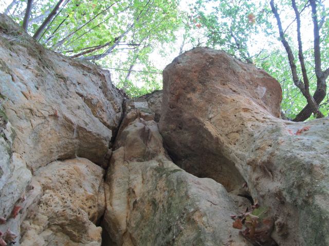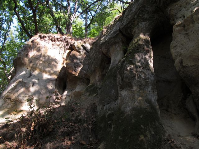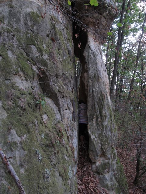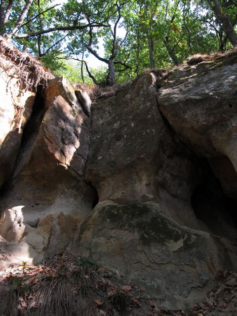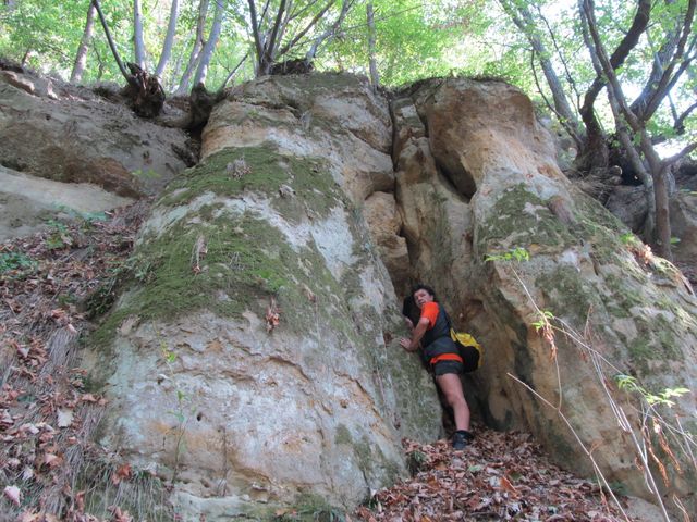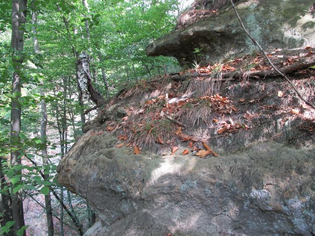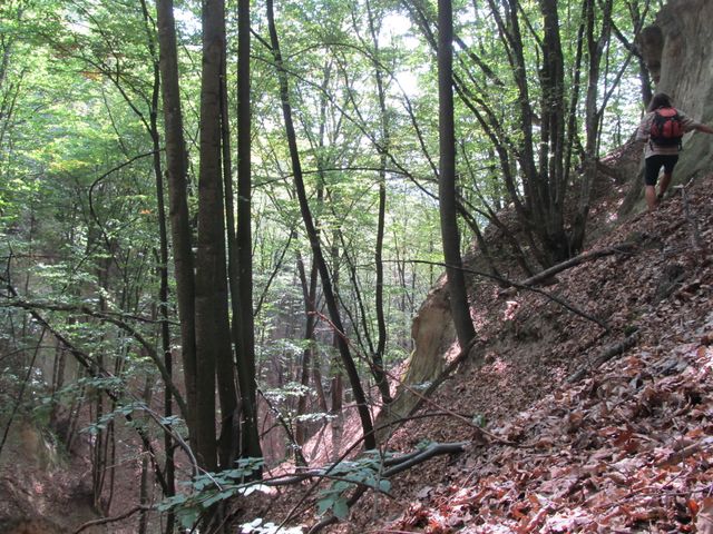 Trecem drumul şi ne afundăm în pădure, dând imediat de panta care nu se lasă prea mult curtată: ori o iei la piept , târându-te în sus în patru labe, ori te laşi păgubaş, altă cale nu există. Formaţiunile care adăpostesc obiectivele pentru care am venit, se pot vedea deja, undeva deaspra noastră, pentru că pădurea de mesteceni, stejari şi carpeni este una tânără. Dar până să ajungem acolo, presimt că mai avem de dat jos câţiva litri de sudoare. Luăm, deci, la piept, panta, iar eu îi sugerez lui Călin ca să atingem blocurile din partea lor stângă, urmând o vălişoară, astfel încât, odată ajunşi sus, să putem lua, apoi, pe rând, toate obiectivele. Dar asta s-a dovedit, în cele din urmă, o greşeală, pentru că, odată sus, ne-am dat seama că e practic imposibil de mers, în siguranţă, la baza stâncilor. E ca şi cum ai fi pe un acoperiş şi ai încerca să umbli pe ţigle: frunzişul de sub tălpile noastre aluneca exact la fel. După o pantă de circa 60 de grade, pe o urcare de peste 100 de metri, când priveşti în urmă, nu e chiar plăcut gândul la ce ţi s-ar putea întâmpla, în cazul în care aluneci. Pentru că e suficientă o simplă scăpare şi mergi în jos ca o săniuţă. Dar, încă nu e pericol: solul e ca un pat moale şi nu ţi-ar putea face mult rău: eventual ceva entorse, dislocări de umăr și contuzii.