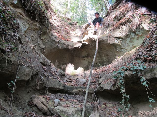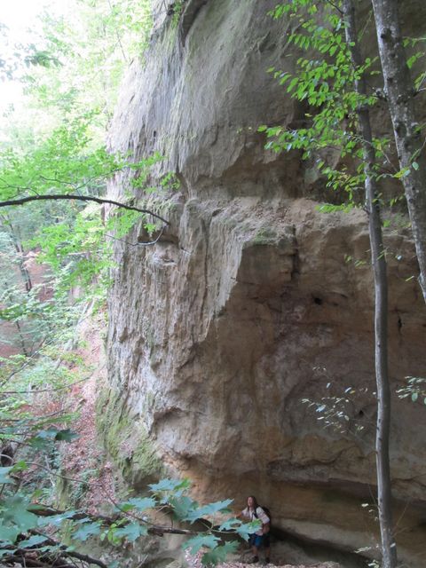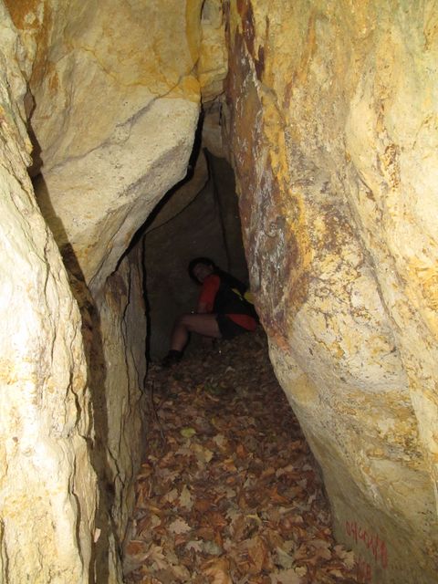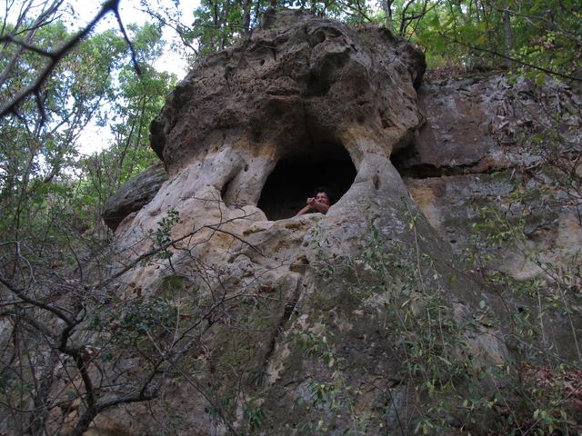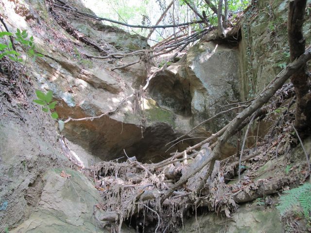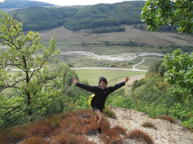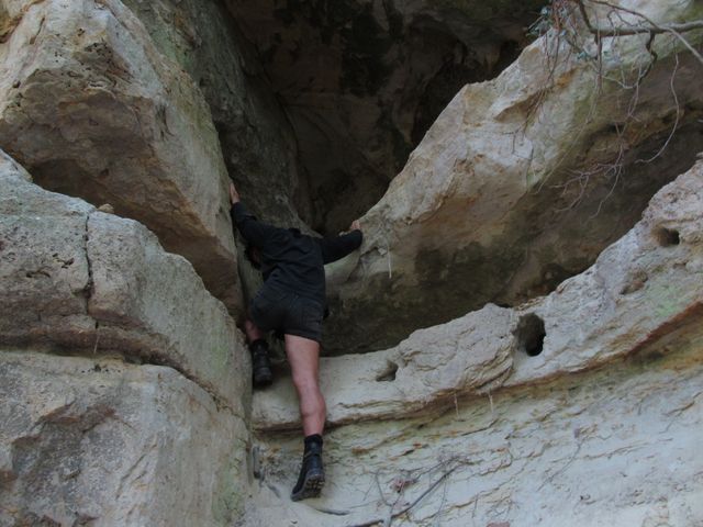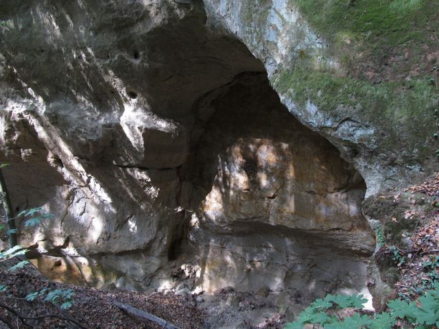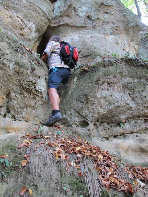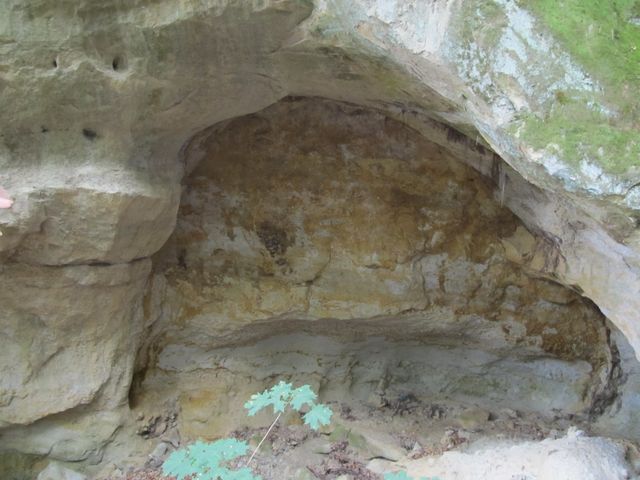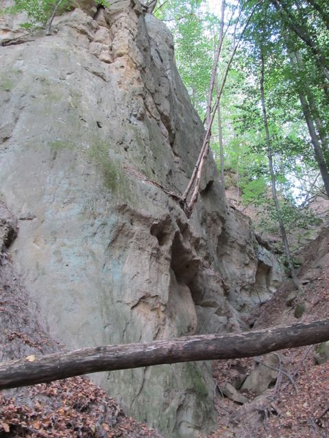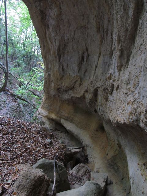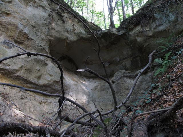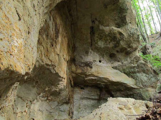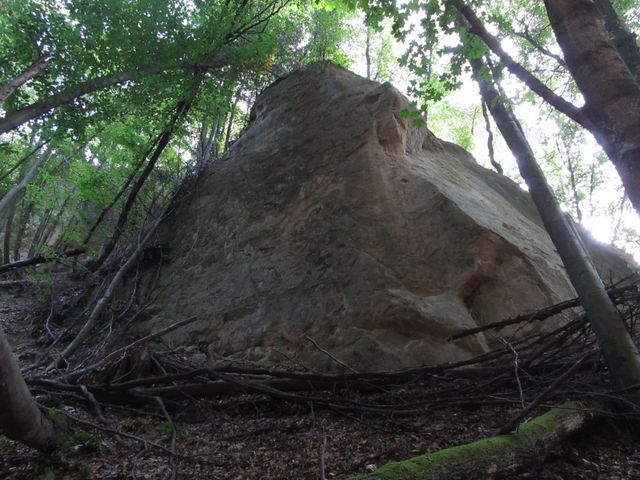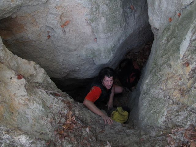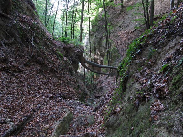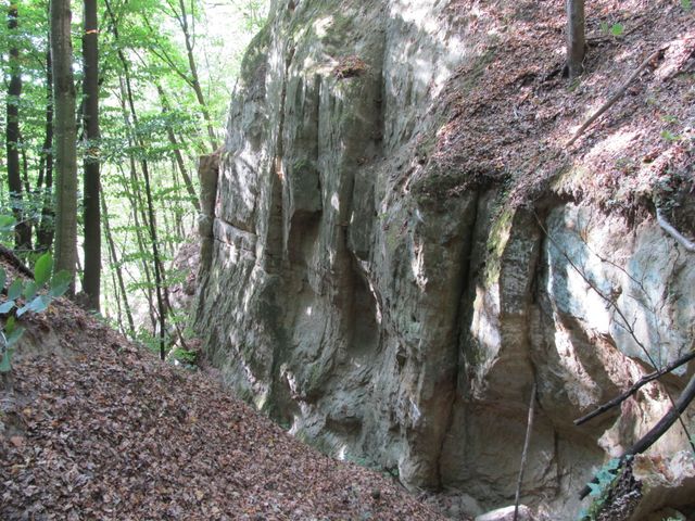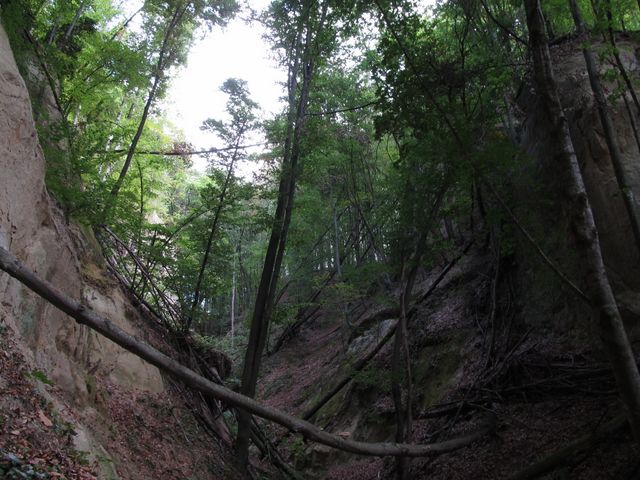 Trecem drumul şi ne afundăm în pădure, dând imediat de panta care nu se lasă prea mult curtată: ori o iei la piept , târându-te în sus în patru labe, ori te laşi păgubaş, altă cale nu există. Formaţiunile care adăpostesc obiectivele pentru care am venit, se pot vedea deja, undeva deaspra noastră, pentru că pădurea de mesteceni, stejari şi carpeni este una tânără. Dar până să ajungem acolo, presimt că mai avem de dat jos câţiva litri de sudoare. Luăm, deci, la piept, panta, iar eu îi sugerez lui Călin ca să atingem blocurile din partea lor stângă, urmând o vălişoară, astfel încât, odată ajunşi sus, să putem lua, apoi, pe rând, toate obiectivele. Dar asta s-a dovedit, în cele din urmă, o greşeală, pentru că, odată sus, ne-am dat seama că e practic imposibil de mers, în siguranţă, la baza stâncilor. E ca şi cum ai fi pe un acoperiş şi ai încerca să umbli pe ţigle: frunzişul de sub tălpile noastre aluneca exact la fel. După o pantă de circa 60 de grade, pe o urcare de peste 100 de metri, când priveşti în urmă, nu e chiar plăcut gândul la ce ţi s-ar putea întâmpla, în cazul în care aluneci. Pentru că e suficientă o simplă scăpare şi mergi în jos ca o săniuţă. Dar, încă nu e pericol: solul e ca un pat moale şi nu ţi-ar putea face mult rău: eventual ceva entorse, dislocări de umăr și contuzii.