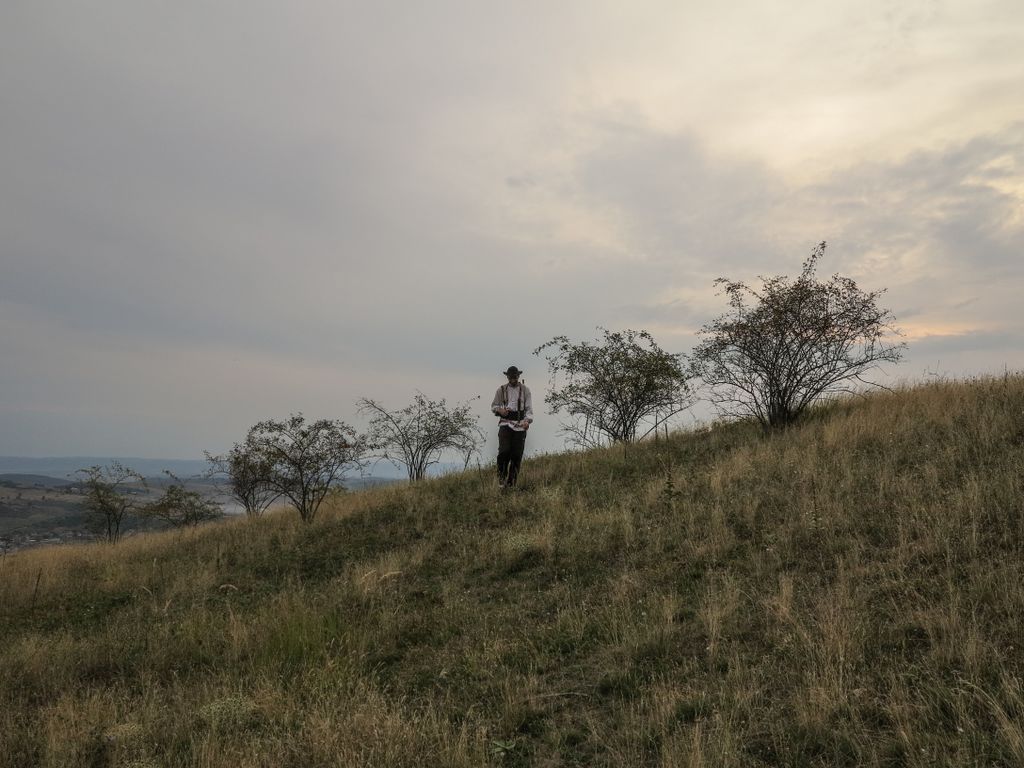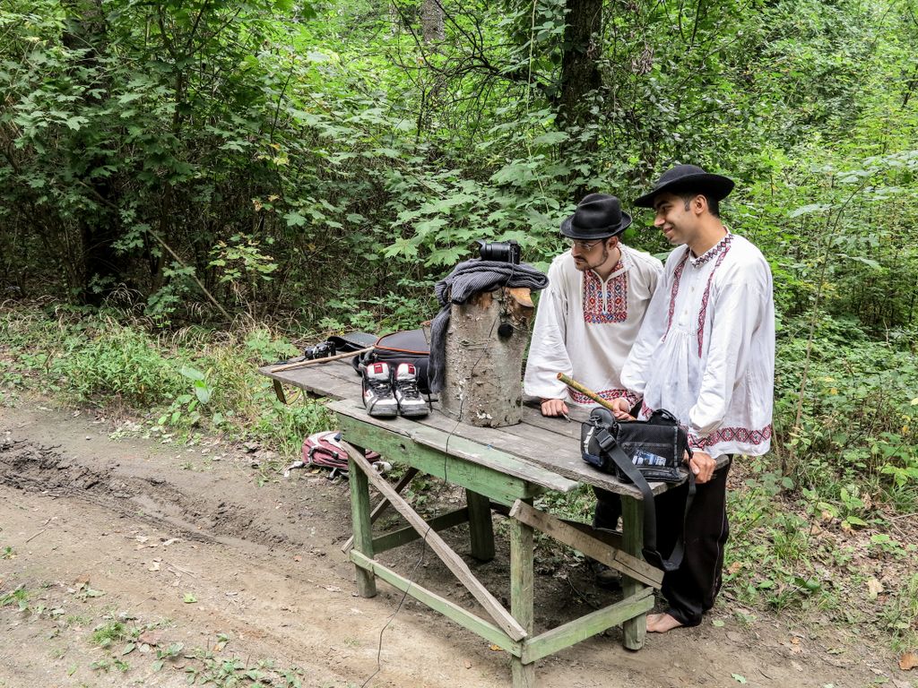 După ce a aflat ce și cum, bucuros că a fost informat și că poate să spună mai departe ce e cu oamenii aceia ciudați îmbrăcați în cămăși țărănești, ori cu ceilalți doi care tot fac poze și mută masa și butucul de lemn pe post de trepied dintr-o parte în alta, a plecat mai departe. Noi am rămas cu muzica și cu zâmbetul, în urma scenetei din pădure, o scenetă în două acte, pentru că a mai urmat una, când am ne-am oprit sub Copacul legii – așa cum se numește un copac uriaș, împrejmuit cu un gard de lemn -, pentru încă o filmare. Normal, că doar cine să treacă fix atunci pe acolo?, apare o dubă care, tot normal, oprește fix lângă noi. Coboară un om din mașină, își scoate telefonul din buzunar, apoi se proțăpește în fața copacului: