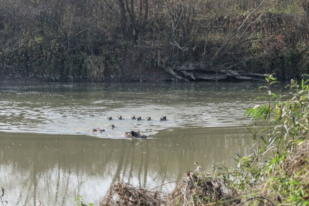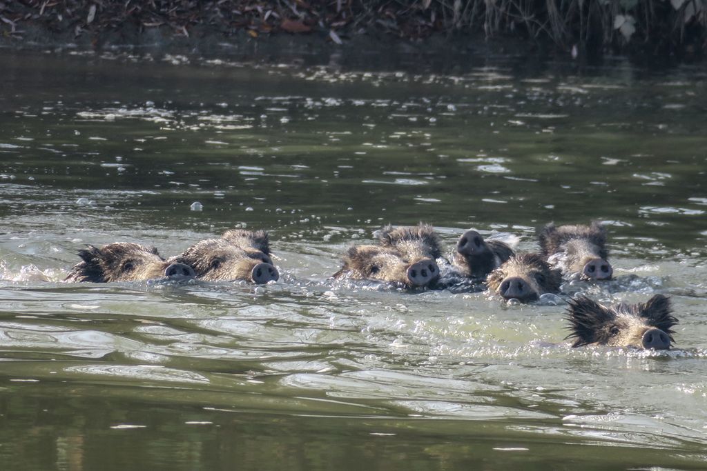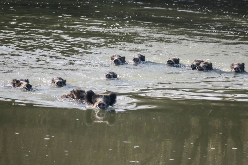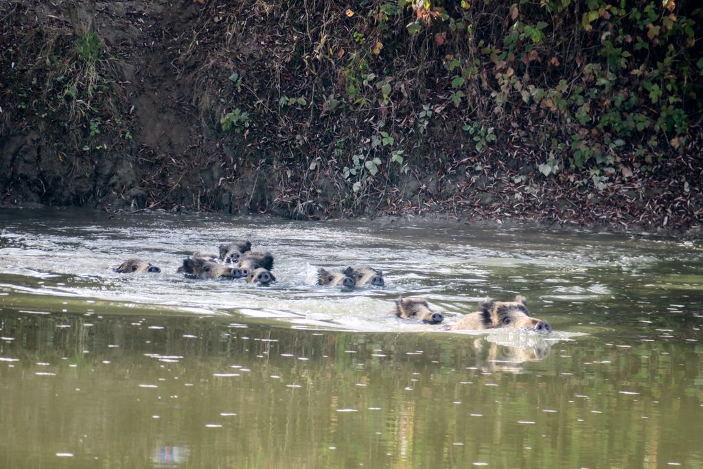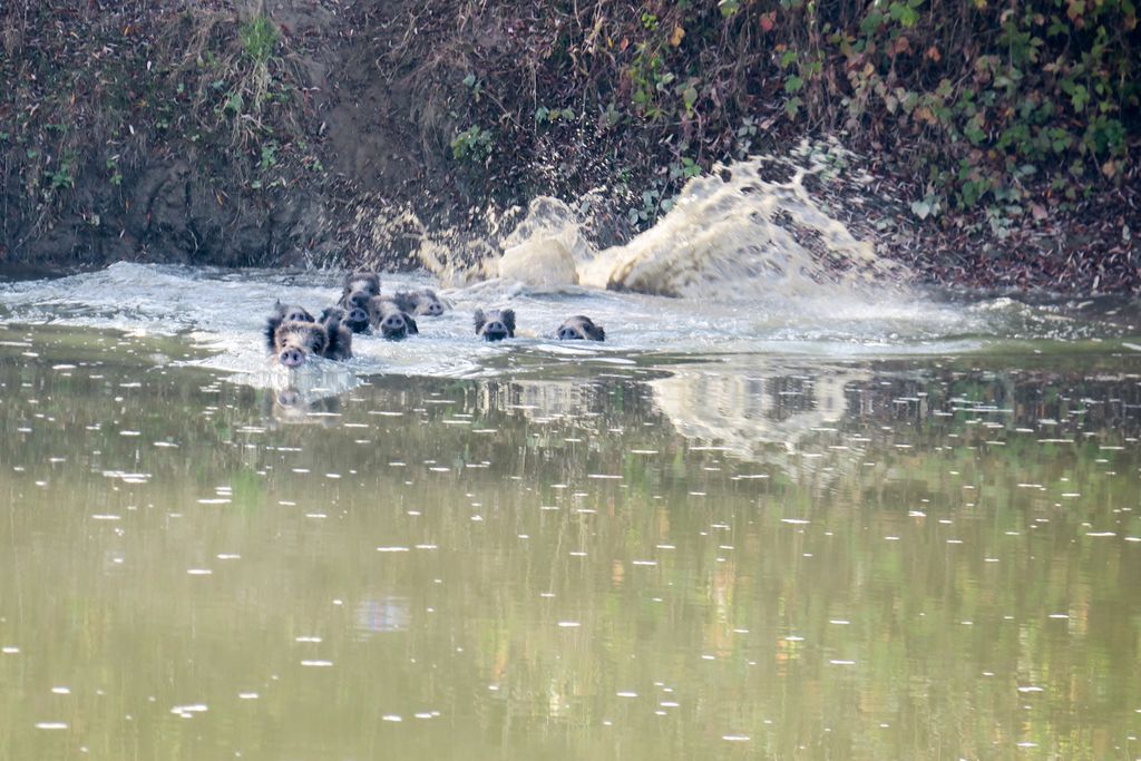 Bietele animale, fugeau de vânători. Iar în fuga lor după viață, la propriu, au ajuns la râu. Primul, cel care conducea turma, era uriaș, ca un tanc. Aproape că nu îmi venea să cred că e real. N-au stat nicio secundă pe gânduri, s-au aruncat în Someș și au început să înoate cu o viteză care i-ar face invidioși și pe cei mai buni înotători de performanță. Atâta tot că înotau exact către noi. Ce să facem? Nici n-aș fi stat în calea lor (tocmai ce fugeau de oameni care voiau să-i omoare, iar pentru ei, noi, de pe un mal al râului, și vânătorii de pe celălalt mal eram la fel), nu de alta, dar trebuie să fii chiar inconștient să te pui cu o turmă de mistreți furioși, care, atunci când vine vorba de supraviețuire, trec peste orice și peste oricine. Pe de altă parte, de câte ori vezi o imagine ca asta? Și atunci, cum să nu încerci să faci măcar o poză?