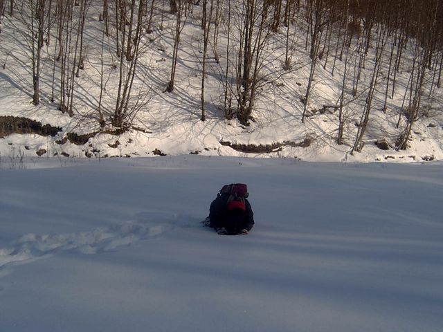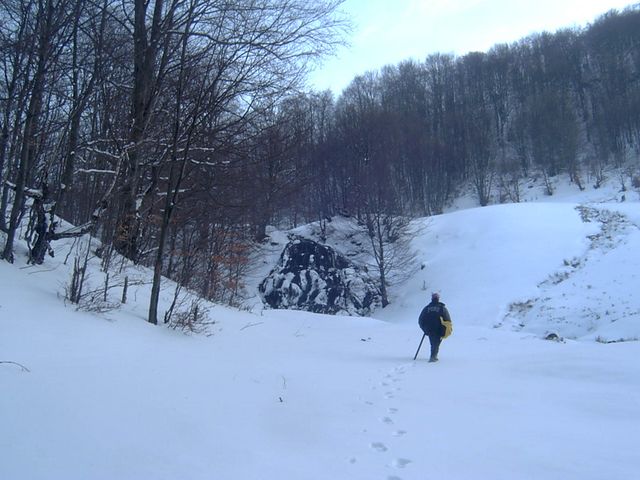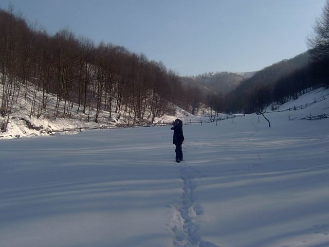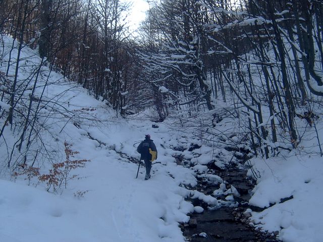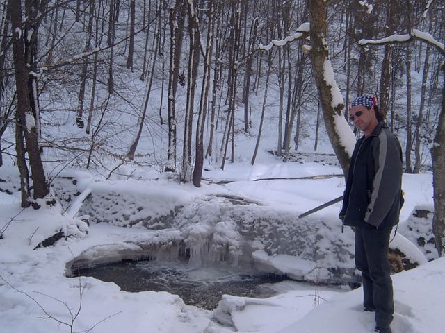 E tarziu, soarele deja a trecut peste padure, se mai vad doar urmele sale aurii. Trebuie sa facem cale intoarsa, sa iesim macar la carare, cat mai avem un pic de lumina. Asa ca, sorry Calin, zic eu, dar trecem pe mars fortat. Avem de parcurs, pana la pastravarie cativa kilometri buni, iar kilometrajul nostru a fost deja pus la incercare. Dar, nu este prima data cand trebuie sa facem lucrul acesta: pur si simplu, bagi capul in piept, turezi motorul si nu te lasi, mergi, mergi, inainte, tot inainte, pana ajungi la capatul drumului. In momentul in care soarele dispare de tot de pe cer, frigul vaii coboara brusc peste noi, amenintator. Trebuie ca, in acele zone, sa fi trecut des sub minus 20 de grade, altfel valea nu ar fi putut ingheta in torentele sale. Trecand peste un fel de podet, gheata cedeaza sub mine, iar piciorul imi dispare pana la genunchi. Dar reflexele-mi sunt atat de rapide, incat bocancul nu apuca sa atinga luciul apei si sunt din nou gata de drum, cu bokken-ul intins in spate, in ajutorul lui Calin, la trecerea peste gaura pe care am lasat-o in urma. Redescoperim, incet, toate reperele pe care le-am lasat in urma la venire si ajungem, dupa circa 80 de minute, la masina. Inghetati, dar fericiti. Suntem doi turturi, cand de gheata, cand de granit. Dupa cum ne lasa Natura.