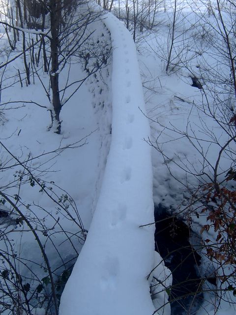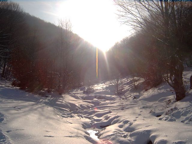 In cale ne iese o femeie, probabil sotia pastravarului, acesta fiind tocmai ocupat de pornirea unei drujbe. Se uita la noi ciudat, dar nu mai bagam in seama privirile de genul acesta. Stim exact cum aratam, ce impresie facem si cati bani valoram. O intrebam despre Izvorul Barcaului, cum se ajunge acolo, moment in care tace si drujba, iar informatiile vin de-a valma, cu cotiri in dreapta sm stanga, sus-jos etc. In fine, retinem noi primele trei-patru indicii, dupa care pornim la drum increzandu-ne, eu mai ales, in instinctul de orientare al lui Calin. Parcurgem, un timp, in sens invers, drumeagul inghetat de pe marginea Vaii Toplitei, oprindu-ne din ce in ce mai des la treptele pe care le face aceasta, un fel de minicascade, unde apa a inghetat, lasand locuri minuscule libere, de unde valea izbucneste ca un fel de gheizer. Murmurul scos de apa care se lupta sa-si gaseasca drumul sub gheata, seamana cu cel al unui avion cu reactie, creand un fundal sonor linistitor, pentru noi, pentru salbaticia spre care tindem. In curand, cotim spre dreapta, urmand valea in amonte, iar urmele drumului se sting, incet-incet, in urma noastra, lasand loc doar unei carari facute de vanatorii care, recent, au impanzit si padurea respectiva, in dorinta lor mascula de a mai zvarli cate un glont in capul vreunui mistret amarat. Dar, dupa cativa kilometri, dispare si cararea, iar zapada ni se descopera neatinsa, alba, imaculata, calcata doar pe alocuri de animale salbatice, ale caror urme (lupi, vulpi, caprioare, mistreti si iepuri), le distingem din ce in ce mai usor. Trecem peste vale pe un fel de podet (de fapt, nu era podet, ci o simpla ingramaditura de gheata, asa cum aveam sa aflu mai tarziu, la intoarcere, cand s-a rupt sub mine), langa care apa aruncandu-se de pe o piatra, sub stratul de gheata aferent, da impresia unui stroboscop natural ce lucreaza incontinuu, un fel de metronom creat de padure, pentru a baga in seama infinitul de langa noi. In fata ochilor, ni se deschide un camp complet alb, cu o zapada inghetata, adanca, pe care Calin se arunca, uitand, pentru o clipa de glezna sa zdrobita pe Meses. Scotand niste sunete ciudate, memorate dintr-o viata anterioara, omul ingenuncheaza spre Soarele care se gaseste chiar deasupra unei aglomerari de stejar, si rosteste un fel de “hubu-bubu”, despre care aveam sa aflu, dupa ce temperatura i-a revenit la normal, ca este o rugaciune inchinata salbaticiei si maretiei albe. Singura sa greseala a fost atunci cand, aruncandu-se in zapada, a uitat sa-si asigure pantalonii, iar acum, cu o cantitate apreciabila de nea in chiloti, are incontinuu, tendinta unor miscari mai netraditionale, in incercarea de a-si feri de inghet amuleta.