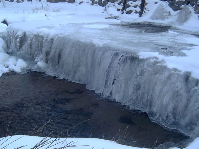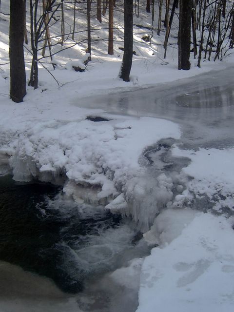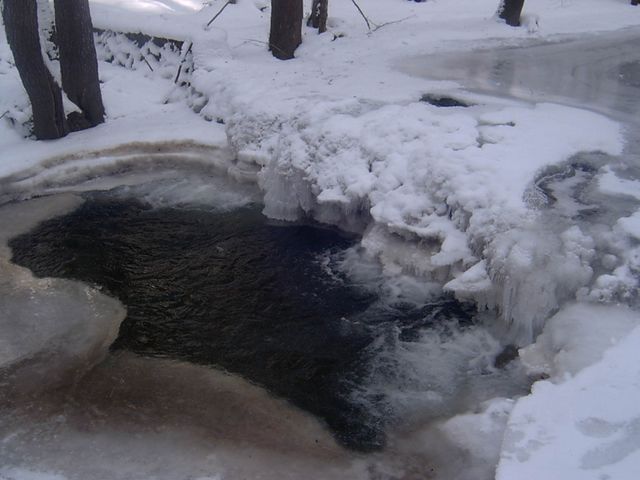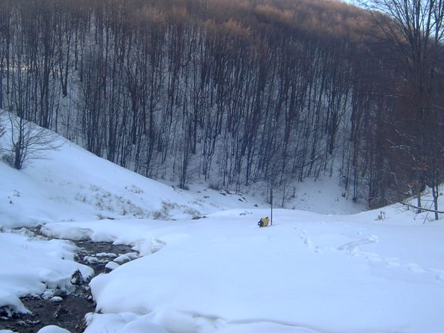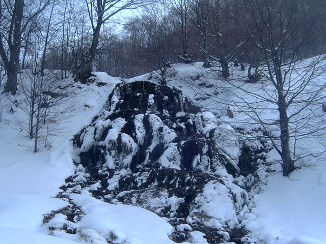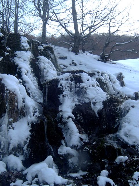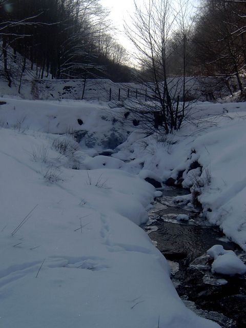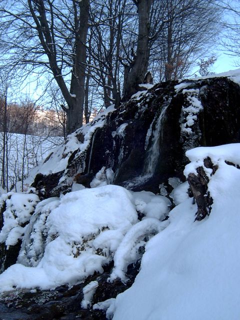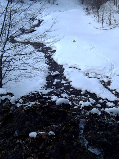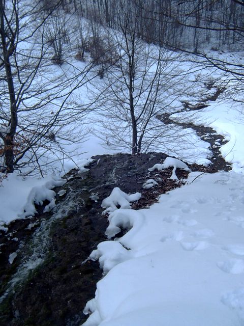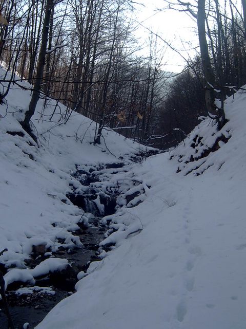 Chiar am fi dorit sa dam peste niste animale salbatice dar, se pare, prezenta noastra e atat de coplesitoare, incat mistretii si lupii s-or fi gandind ca suntem noi suficient de animale si nu mai merita sa-si faca simtita prezenta. Auzim, doar de vreo doua ori, niste ragete in apropierea noastra, dar degeaba scrutam imprejurimile, nu reusim sa dam de urma lor. De undeva, dinspre dreapta noastra, se vede clar, cararea batatorita, lasata de o turma de mistreti care au coborat din padure la vale, sa se adape. Pe unul dintre zagazurile ce pot fi intalnite des pe Vale, puse acolo ca sa mai astampere furia apei in momentele ei mai nebunatice, se disting clar urmele unui lup ce a traversat spre celalalt mal. Dar chiar si aceste urme dispar, in timp ce ne continuam drumul spre amonte, valea devenind din ce in ce mai salbatica obligandu-ne, des, la salturi de pe un mal pe altul. E o zona in care bokken-ul isi aduce un aport fericit expeditiei noastre, oferind punct de sprijin unui Calin, care se misca ceva mai anevoios, evident, pe langa urmele mele, gasind sub talpi toate pietrele, crengile etc, ce-l fac sa-si piarda echilibrul, si asa fragil. Ma uit din ce in ce mai des la ceas: e deja trecut de trei, marsaluim de doua ore, iar izvorul nu vrea nicicum sa se arate. Vreau sa pun punct, de mai multe ori, expeditiei, chiar daca ar insemna sa ne intoarcem cu mainile goale, dar Calin ma trage tot mai departe, fiind convins ca “la urmatoarea cotitura” ajungem unde trebuie. Iar, dupa ce trecem peste vreo alte zeci de “urmatoarea cotitura” ajungem, intr-adevar, la un perete de vreo 10 de metri, acoperit de muschi si de sloiuri de gheata, peste care apa curgea in mii de fire, dand impresia unei revarsari superbe. Evident, chiar daca peretele putea fi ocolit, noi il luam in brate si il urcam, indeferenti la semnalele de alunecare pe care ni le transmit bocancii. De fapt, mi-am dat seama acum, cand e vorba de o catarare, nimic nu ne mai intereseaza. In cazul in care mai apucam, ne gandim la cat de periculos a fost, dupa ce suntem sus. Iar sus, la o distanta de circa 50 de metri de perete, dam peste Izbucul Mare, care-si arunca apele din pamant cu o forta si un debit apreciabil. E o senzatie extraordinara sa stai langa o astfel de minunatie a naturii, sa vezi si sa auzi locul si gemetele scoase de un izvor, nelinistea caruia se transforma, dupa zeci de kilometri, intr-un adevarat rau.