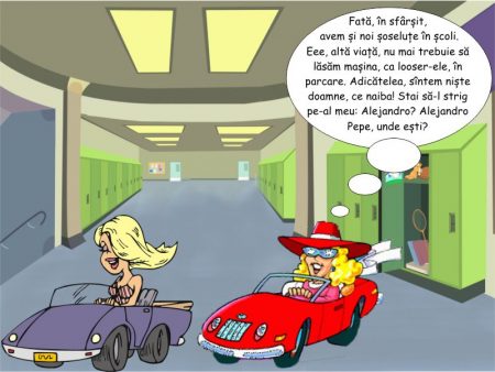– Așa-i. Ce mai, sîntem niște doamne. De aia, trebuie neapărat să facem o ședință cu părinții și să le cerem profesorilor să facă niște șosele în holurile școlii, că nu se poate să trebuiască să ieșim din mașină și să mai avem de mers și pe jos. Eeee, numai la noi e așa, dincolo, în străinătate, au șosele, ba chiar cred că au și saloane de înfrumusețare prin școli, că nu se știe niciodată dacă nu cumva ajungi mai repede și mai ai timp de-o pedichiură, ceva. Da, auzi, fată, l-ai văzut pe masculul cu Jeep-ul ăla mare și alb care a parcat între băncile din rândul întâi? Așa-i că ți se zbat genele false de la emoții? Hai repede și noi, că ai noștri-s colegi de clasă cu al lui, și poate reușim să ne atingem din greșeală. Alejandro? Alejandro Pepe, unde ești?