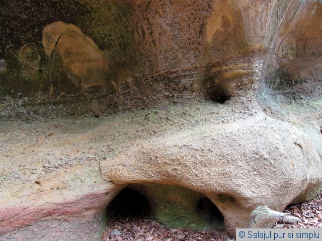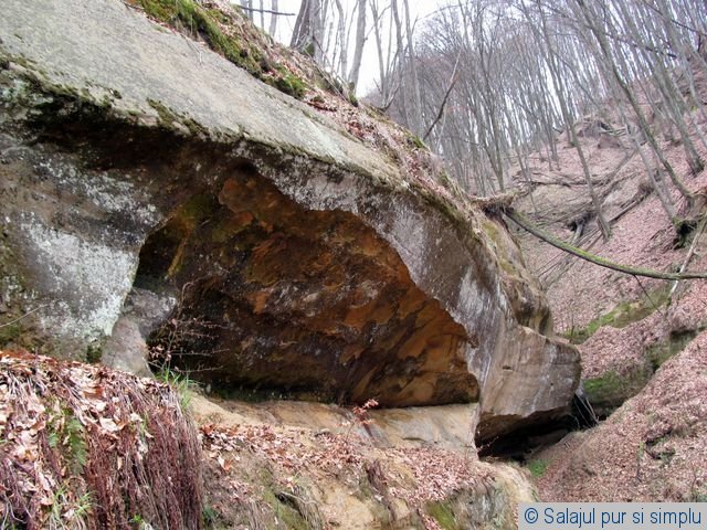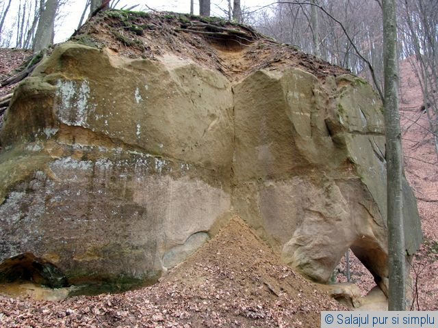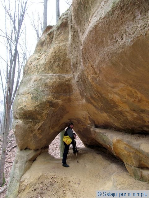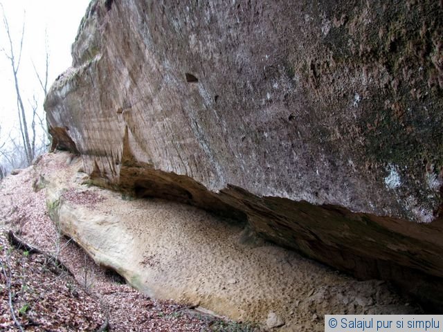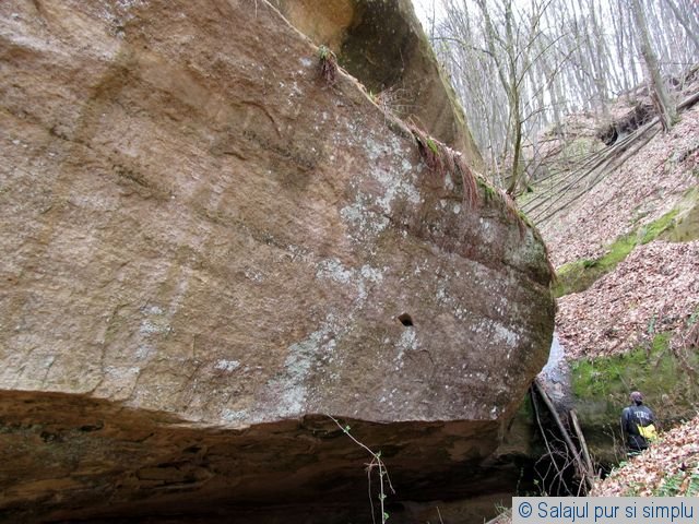 Terenul e un pic moale, dar frunzișul des de pe jos parcă mai atenuează din umezeala ultimelor săptămîni. Mergem pe malul pîrîiașului, evident, în pantă și, după cîteva sute de metri, în fața noastră răsare o „piatră” măricică, cam de vreo 10 metri, în formă de ciupercă. La una dintre baze, acolo unde se apleacă spre marginea văii, arhitectul Natura i-a pus o coloană de susținere, astfel că poți intra sub ciupercă, pe lîngă coloană, dintr-o parte în alta.