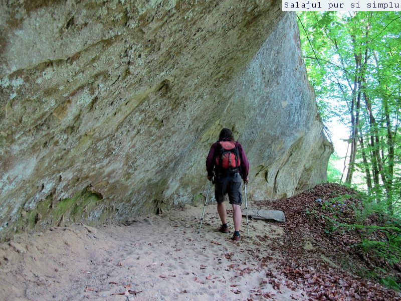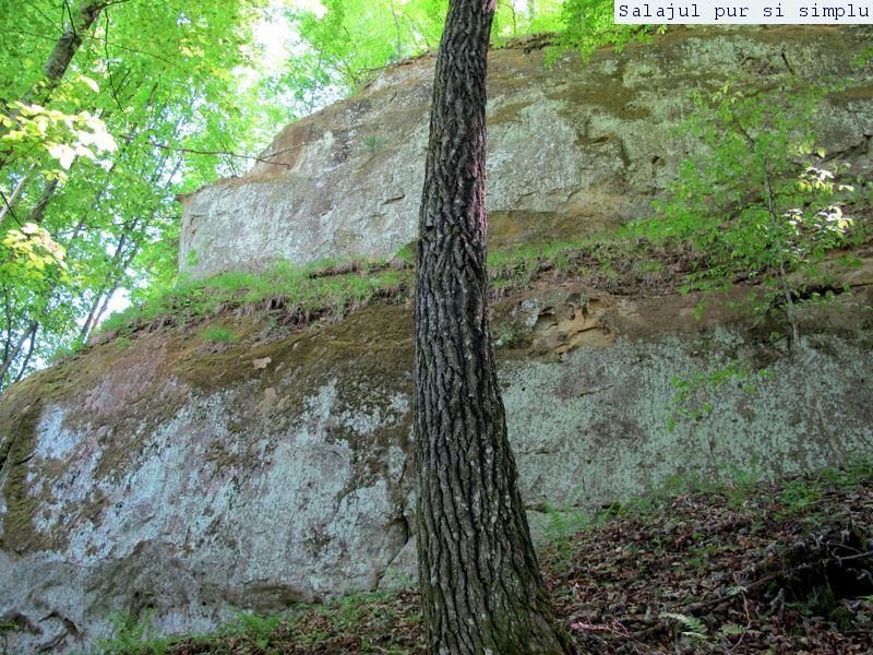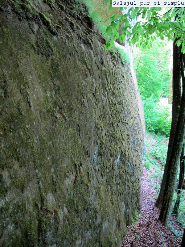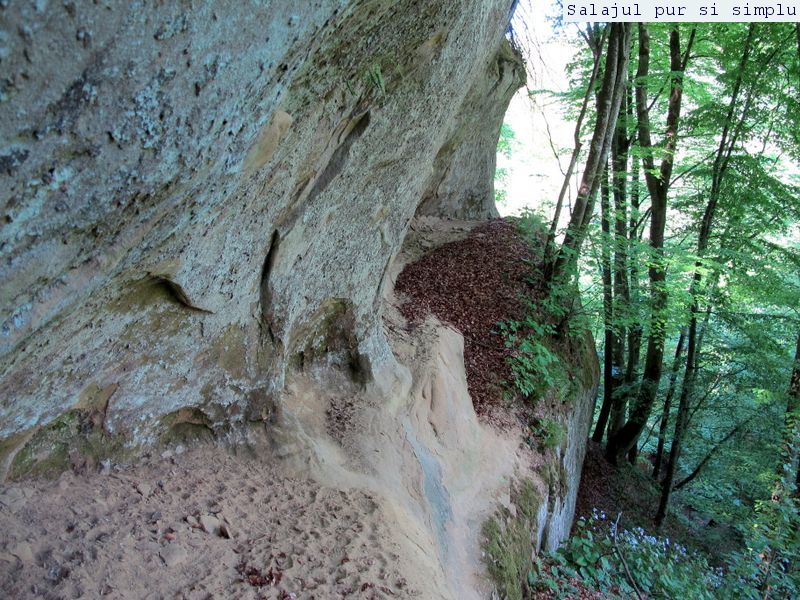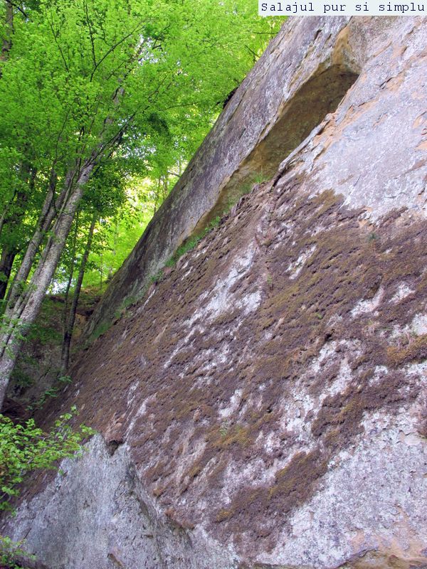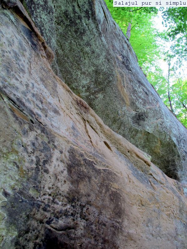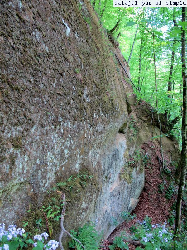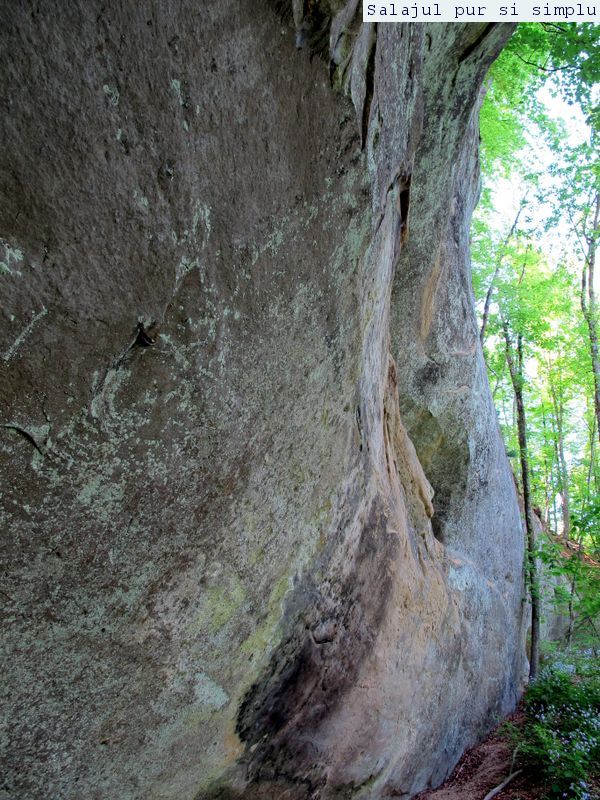 După ce-am făcut inventarul “stricăciunilor”, așezat sub bolta abriului, am coborât la baza stâncilor, unde, printr-un câmp de flori și urzici, numai bune să mă scape de reumatism pentru vreo 50 de ani, am traversat poiana, apoi am luat-o, din nou, către stânci. În fața mea, peretele. Și ce perete! Vreo 25 de metri înălțime, compact și lung, ca un piton uriaș de piatră, pe lângă care am mers încet, zidul care părea că se apleacă peste mine aproape copleșindu-mă. Am dat peste încă un abri, in interiorul căruia nisipul fin, gălbui, rezultat din eroziunea gresiilor, aproape că îți dădea impresia că ești pe plajă, și am umblat ca un copil cu bocancii prin nisip, imprimându-mi urmele acolo… Am lăsat plaja abriului și mi-am continuat drumul prin scobitura uriașă din stâncă, lungă de vreo 30 de metri, am trecut peste o brână îngustă, apoi drumul a devenit prea periculos ca să mai pot merge mai departe în siguranță. Brăna îngustă de 10 centimetri lăsa să se vadă dedesubt golul imens, care, în caz că picai, nu-ți dădea nici o șansă. Și, după pățania de dinainte, mi-am zis că e mai bine să cobor de acolo, chiar dacă exuberanța îmi dădea iar târcoale, așa că am coborât la baza peretelui, copleșit, din nou, de imensitatea lui, de parcă ziceai că acum-acum se prăvale peste mine, mai ales că stăteam cu capul dat pe spate, încercând să-l cuprind tot cu privirea. Am urcat iar, mi-am umplut bocancii cu nisipul fin al scobiturii lungi din stâncă, iar am coborât, am mai urcat o dată, apoi, într-un final, am ajuns la capătul zidului. Și acum, încotro?