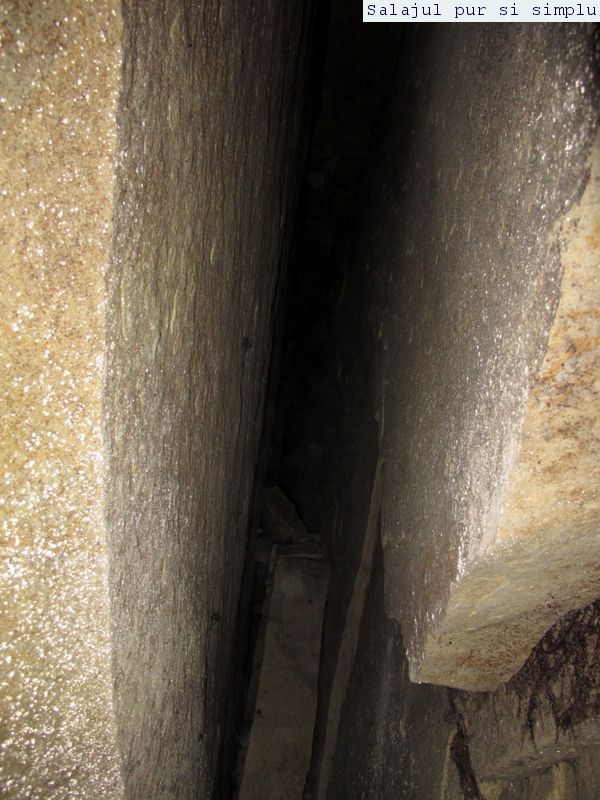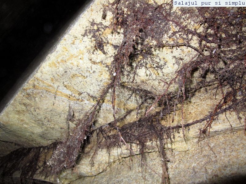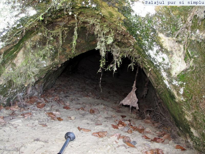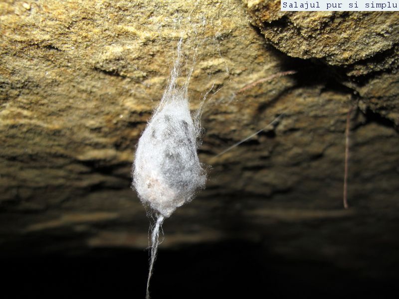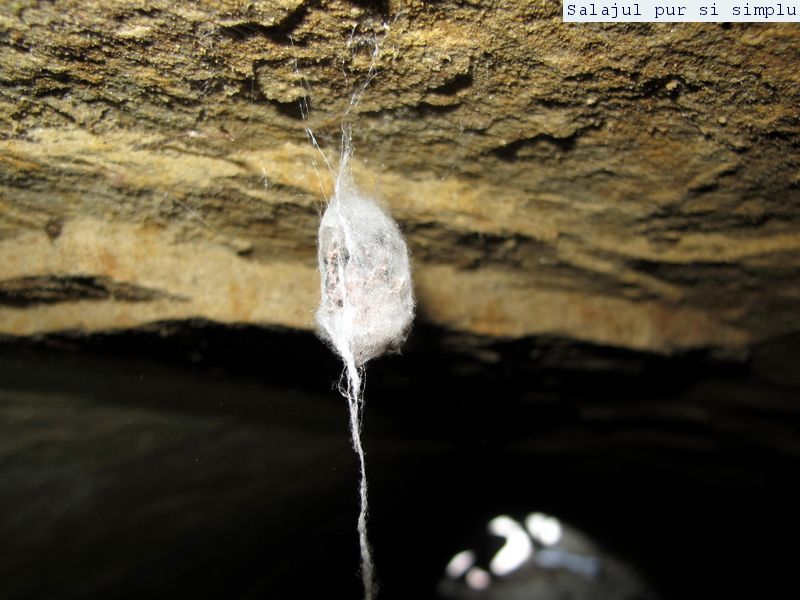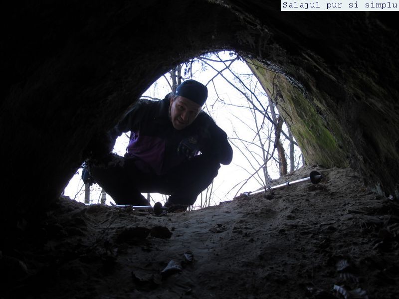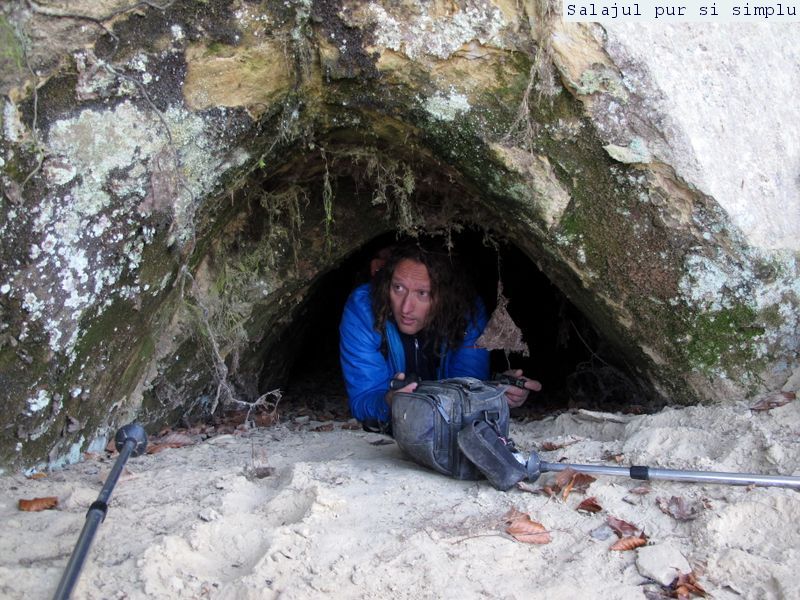 Băgîndu-mi doar capul în gura peșterii, pentru că intrarea e destul de strîmtă (ăștia care știți bancul, vă rog să rămîneți serioși!) luminez înăuntru și presupun că ar fi vorba doar de o galerie de vreo 10 metri. Așadar, renunț la a mă tîrî pe burtă în interior. Călin nu. Intră, se trage, se împinge, icnește și prospectează. Prospectează paianjenii mari de pe pereți, care-s atît de mulți, încît peretele pare viu. De tavan stă agățat un cocon, în care pare să fie ceva viu. E clar, am dat de portalul extratereștrilor. Mai la fund există o crăpătură destul de ciudată, prin care poate-poate s-ar putea continua drumul spre interior, dar deja chiar și Călin se simte necomfortabil în galeria cu paianjeni ce se mișcă încontinuu. Bine că n-am intrat eu. Mă crizam pe loc!