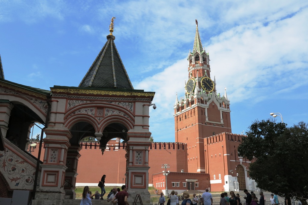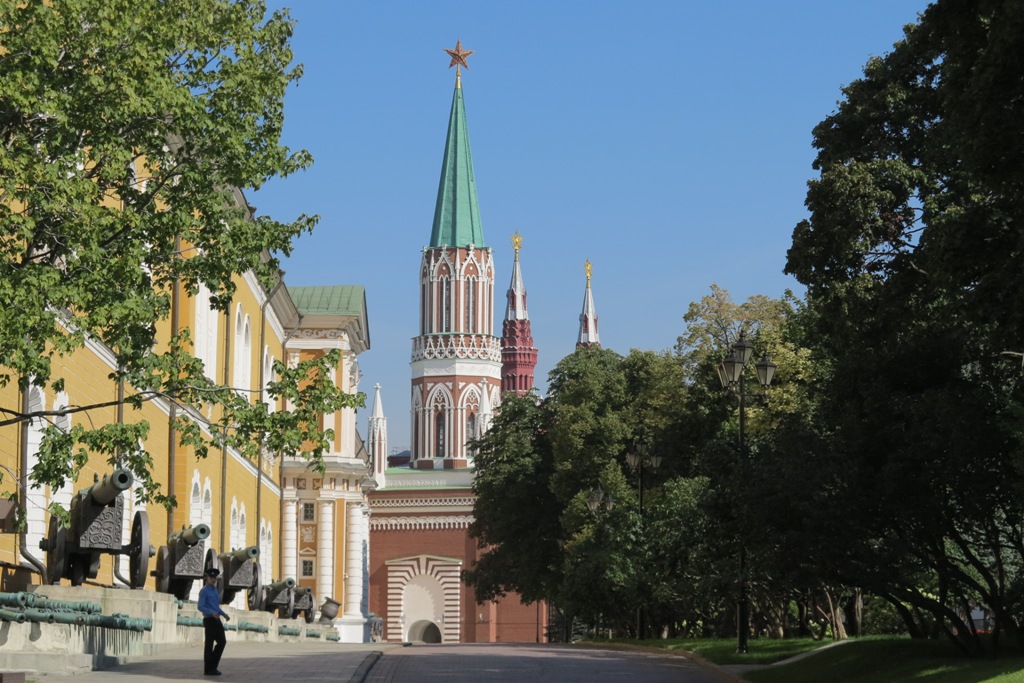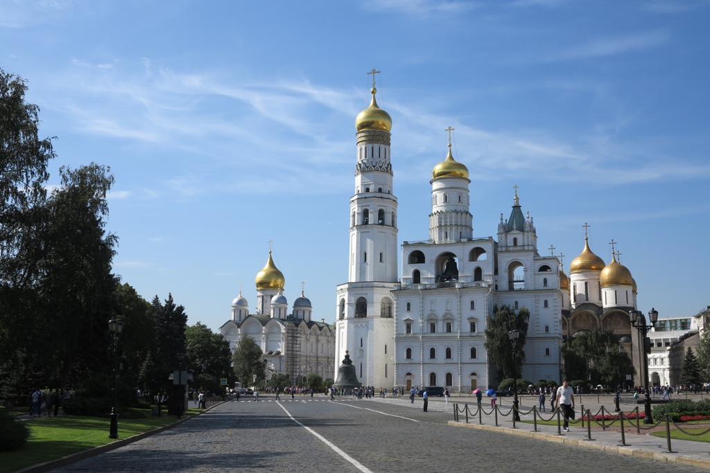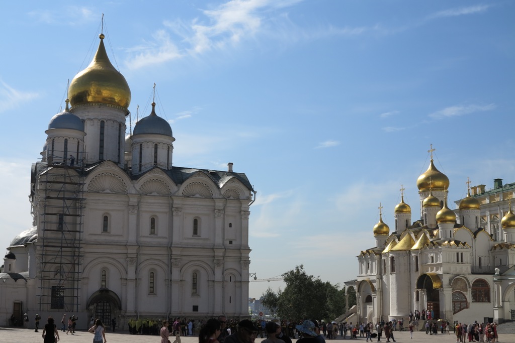 Nu departe de Catedrala Sf. Vasile, în capătul celălalt al Pieței Roșii se află Kremlinul, care este un centru istoric fortificat care cuprinde patru catedrale, patru palate, un zid lângă râul Moskva și Grădinile lui Alexandru. Tot aici am putut admira Turnul lui Ivan cel Groaznic care marchează centrul geografic al Moscovei și în care se găsesc 22 de clopote din care cel mai mare cântărește 70 de tone. E o lume pestriță aici și hoarde întregi de turiști asiatici în grupuri organizate, care se opresc lângă fiecare trandafir, bancă, squar pentru a-și face zeci de poze: cu zâmbet, fără zâmbet, cu pălărie, fără pălărie, cu ochelari de soare, fără ochelari etc. Ei au fost și motivul pentru care am renunțat să intrăm în toate catedralele din Kremlin pentru că ar fi însemnat să așteptăm câteva ore la cozi interminabile, așa că am preferat să ne plimbăm pe aleile liniștite și să admirăm ce e de admirat de afară.