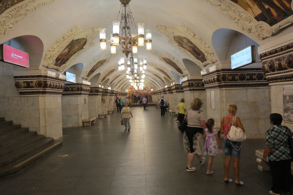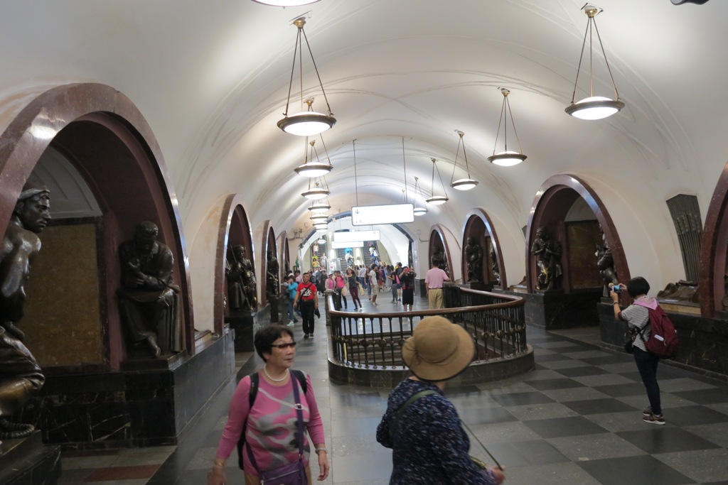 Ce nu are cum să nu te impresioneze la Moscova este metroul al cărui stații sunt adevărate galerii de artă cu marmură albă, tavane înalte, candelabre maiestuoase, statui de bronz, basoreliefuri, vitralii, tablouri, mozaicuri și multe altele, multe dintre ele fiind influențate de perioada socialistă. În stația Piața Revoluției rușii obișnuiesc să atingă în trecere diferite părți ale unor statui, cum ar fi cocoșul, pentru a le aduce noroc. Metroul moscovit se întinde pe 300 de kilometri, are circa 200 de stații, și a fost inaugurat în 1935 pe vremea lui Stalin.