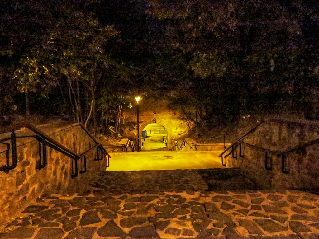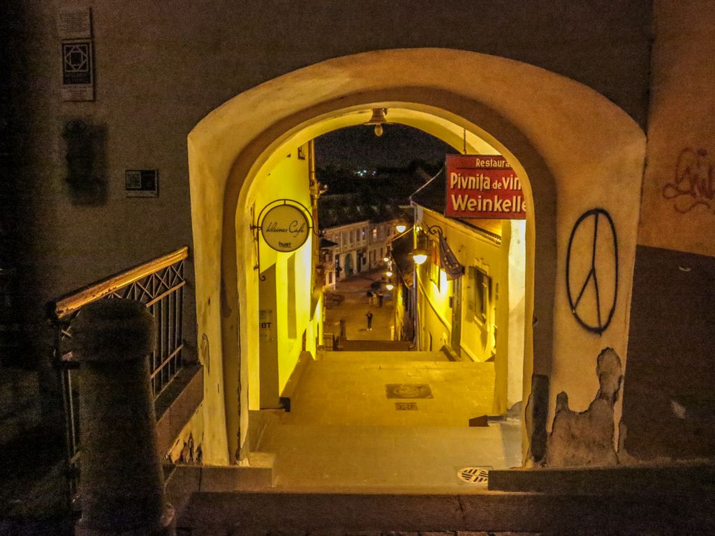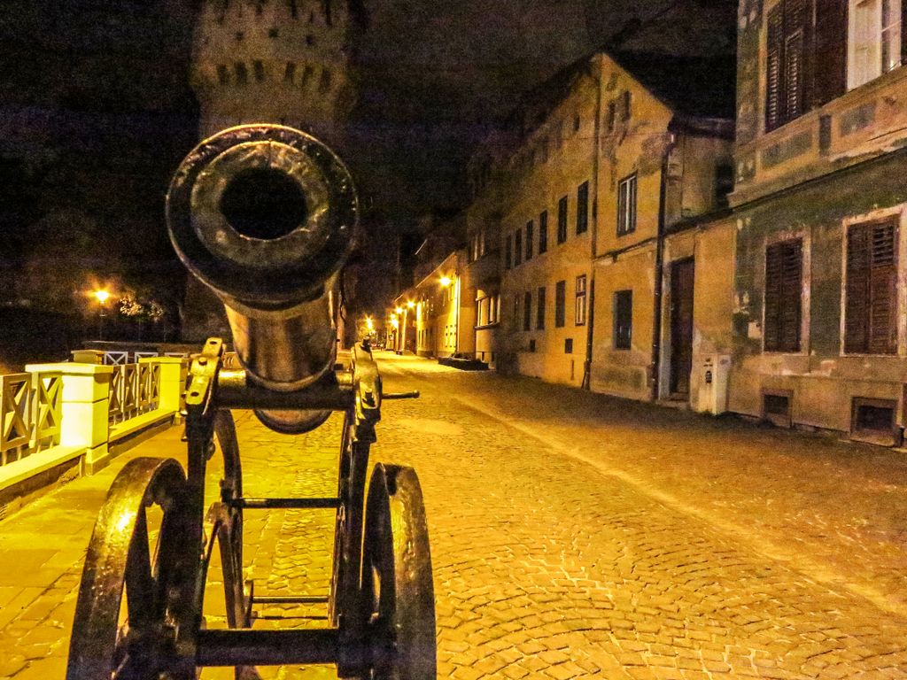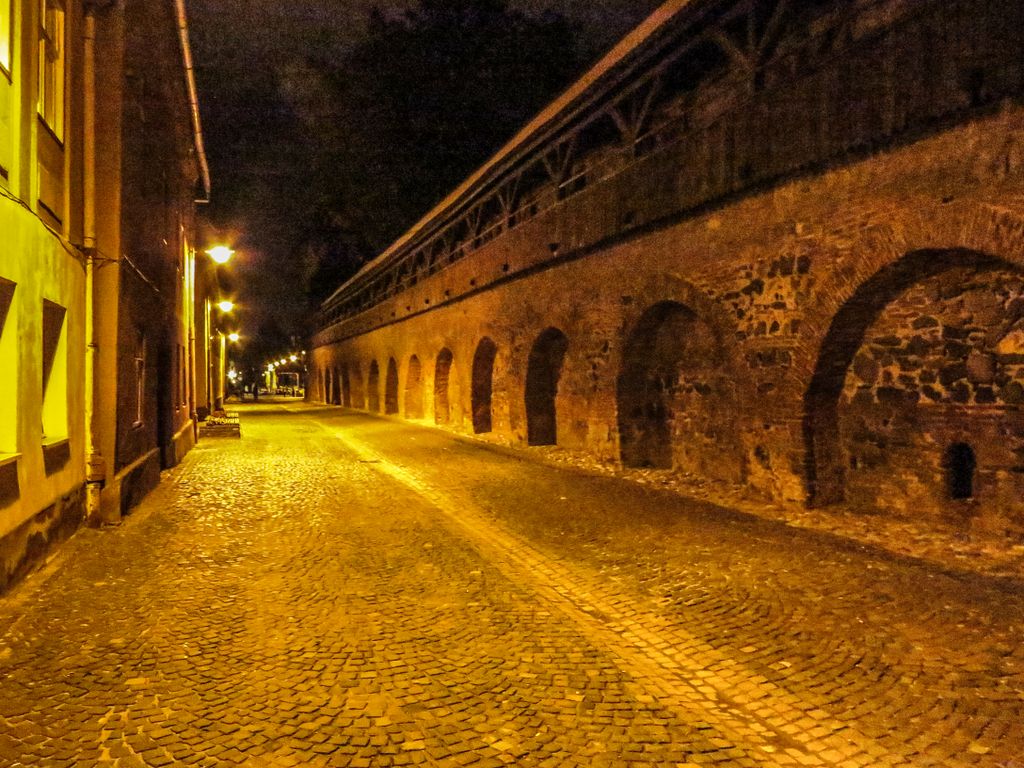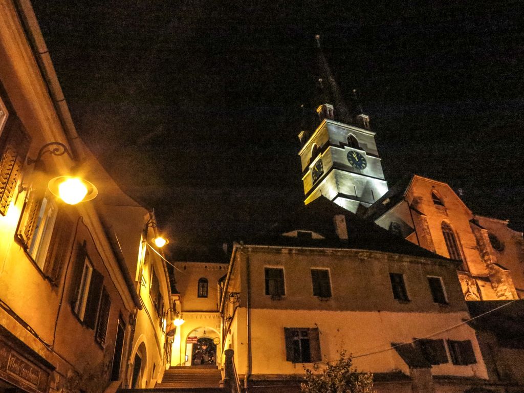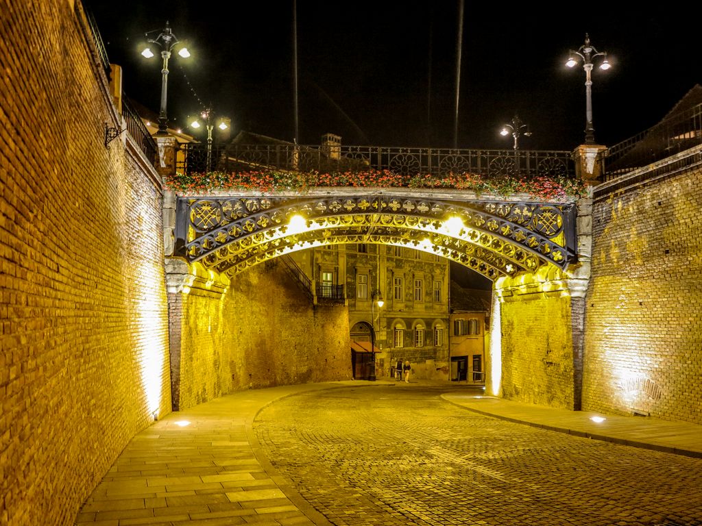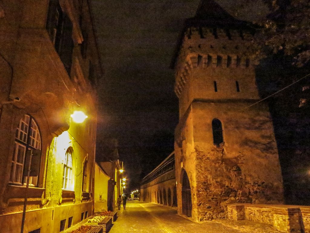 Strada Cetăţii, ce poartă şi plăcuţa cu cea mai frumoasă stradă din Sibiu, noaptea este pustie, iar arcurile zidului medieval şi cele trei turnuri ce o străjuiesc la capete, Turnul Archebuzierilor, Turnul Olarilor şi Turnul Dulgherilor, ultimele două fiind legate între ele printr-o galerie acoperită din lemn, sunt suficiente ca să te facă să crezi eşti dincolo de timp şi că în orice clipă ai putea da nas în nas cu un cavaler, fără să-ţi dai seama dacă a făcut el un salt în viitor, te-ai întors tu în timp sau v-aţi întâlnit amândoi, undeva la mijoc. Cum întunericul camuflează tot felul de detalii, iar felinarele scot în evidenţă părţile cele mai frumoase, noaptea, Sibiul îţi arată partea medievală, mai mult ca oricând, aşa că dacă ai ocazia, ia străzile la pas după lăsarea întunericului şi nu o să-ţi pară rău, pentru că ce o să ţi se dezvăluie o să fie cât o carte de istorie.