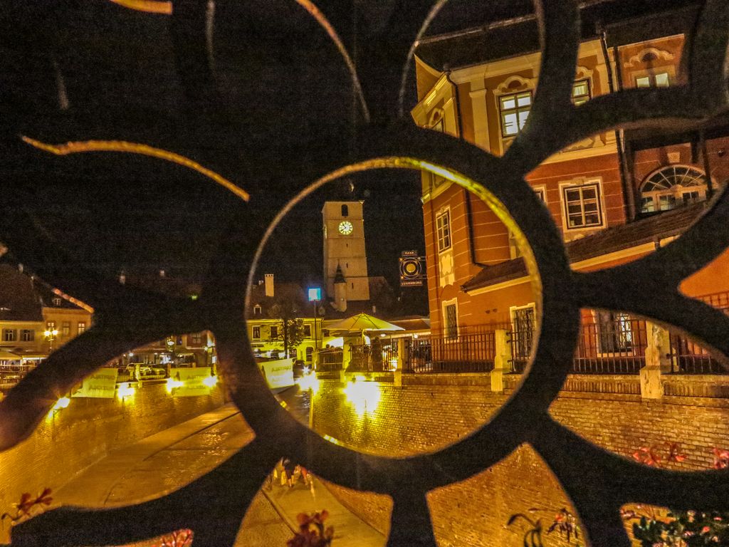 Oricât de pitoresc, cosmopolit şi vesel ar fi Sibiul în timpul zilei, noaptea, la lumina felinarelor, are cu siguranţă ceva aparte. Un fel de uite-mă, sunt aici, vino mai aproape şi descoperă-mă. Un joc de umbre şi lumini, care dau clădirilor vechi şi străzilor medievale un aer misterios şi impresia că dincolo de întuneric mai multe perechi de ochi te privesc curioşi. Asta şi pentru că vechile case ale Sibiului au o particularitate aparte, şi anume câte două ferestre mici în acoperiş, ca doi ochi migdalaţi, care nu au cum să nu-ţi atragă atenţia şi să-ţi dea impresia că cineva te priveşte, în permanenţă, oriunde te-ai duce. Iar dacă paşii te poartă tocmai pe Podul Minciunilor, cel mai vechi pod de fontă din România, împodobit cu jardiniere cu flori colorate în roşu, îţi va sări cu siguranţă întrebarea , dacă nu eşti de-a locului, de unde şi până unde a minciunilor.