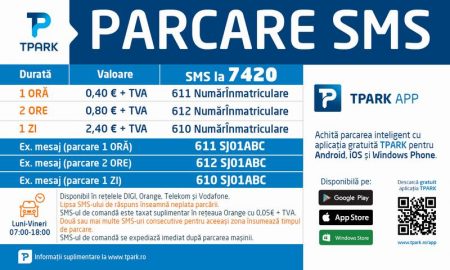 Pentru plata parcării prin SMS, clientul va trimite un SMS la numărul scurt 7420 cu textul: 611 NR. MAȘINĂ (parcare o oră); 612 NR. MAȘINĂ (parcare două ore) sau 610 NR. MAȘINĂ (parcare o zi). Pentru plata parcării prin intermediul aplicației TPARK, clientul va descărca aplicația, după care va introduce numărul de înmatriculare, va selecta orașul și durata, iar în final va selecta butonul “Parcați”. După parcurgerea pașilor de mai sus, în cazul ambelor variante, clientul va primi mesaj de confirmare.