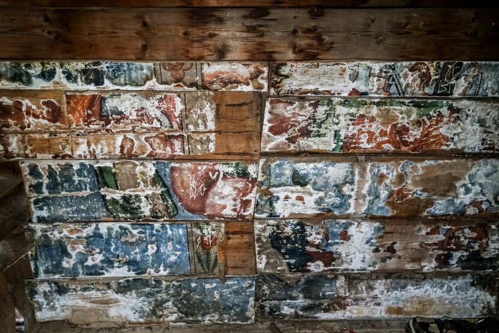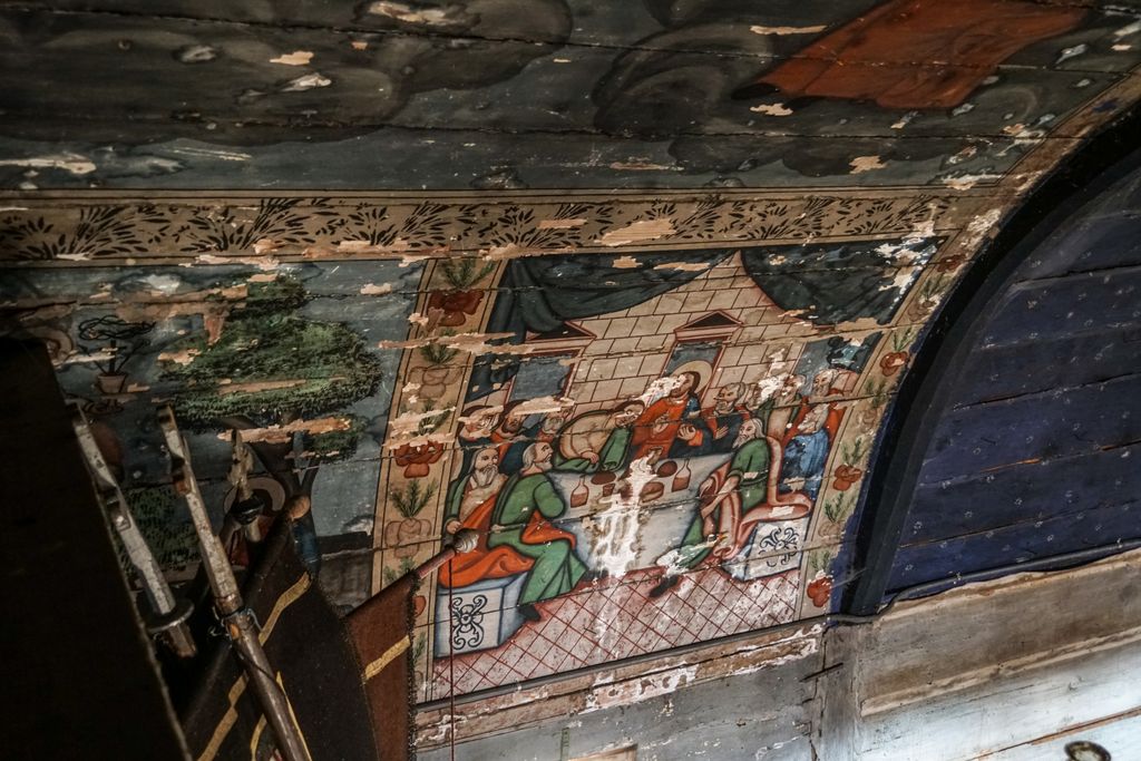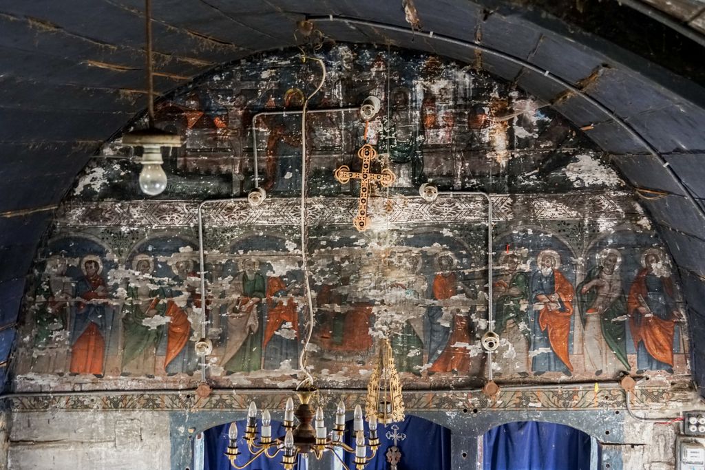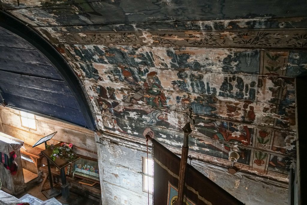 Pictura a fost realizată de cunoscutul zugrav itinerant de biserici Ioan Pop din Românași, cel care a mai pictat, pe aceeași vale, și alte biserici cum sunt cele din Păușa, Bozna, Chichișa sau Creaca. Anul realizării picturii murale este 1810, menționat în pisania păstrată fragmentar pe iconostas. Pictura s–a păstrat în altar (chipuri de prooroci, Sfinții Părinți), pe bolta naosului, acolo unde se afla inițial biserica bărbaților (teme din ciclul hristologic: Punerea pe cruce, Cina cea de Taină, Evangheliștii) și în pronaos (Pilda celor 10 fecioare). Din păcate, odată cu construirea, la mică distanță, mai la vale, a bisericii noi de zid cu hramul „Pogorârea Sfântului Duh”, biserica de lemn a fost dată uitării.