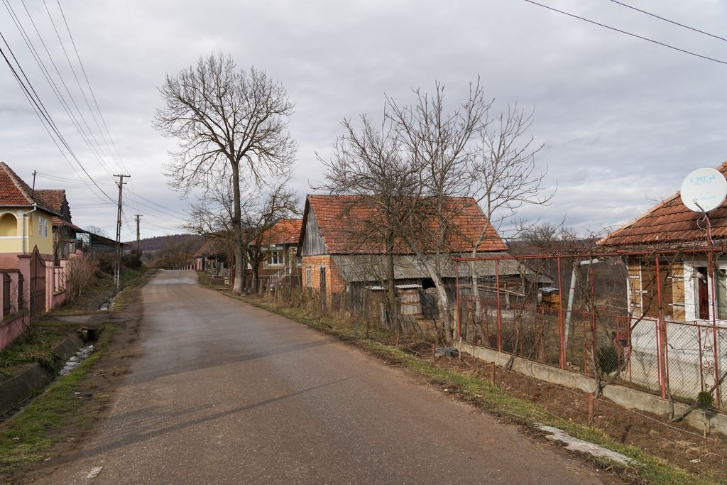 așezat între dealuri, se așază firesc în pitorescul zonei, și, privit de sus, de pe deal, pare o pictură.