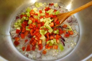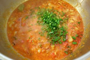 Noa, tai și porodicile coșcuță și mai tai roatie mnici și duauă hire die ceapă verdie și on hir die ai verdie. Numa partea ceie albă o tai cam diodată, da nu țâpa coadile verz că li folosâ și pă iele. Ș-api ti-apuci și cârcălești înt-on laboș, cu unsoare ori cu oloi, primaș dată ceapa, ceapa verdie și aiu, amesteci una-n-truna, pui o țârucă die sare și mintenași țâpti păstă ceapă thipărușile tăiete, iară amesteci, le lași on pticuț să forcotească, să să mai moaie și una și alta, da nu tare, nu le zdrobdi că mai au die hiert… Pui porodicile, îi videa că să face o zamă faină, tăt amesteci ș-o mai lași, pui și o frunză die dafin.