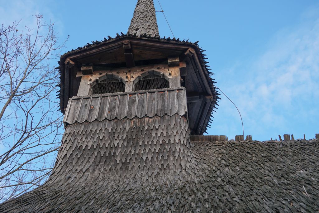 Turnul, ciuruit de ciocănitori, se află în partea de vest a construcției și se sprijină pe grinzile masive ale pronaosului. Este scund, cu foișor și fleșă de mică înălțime.