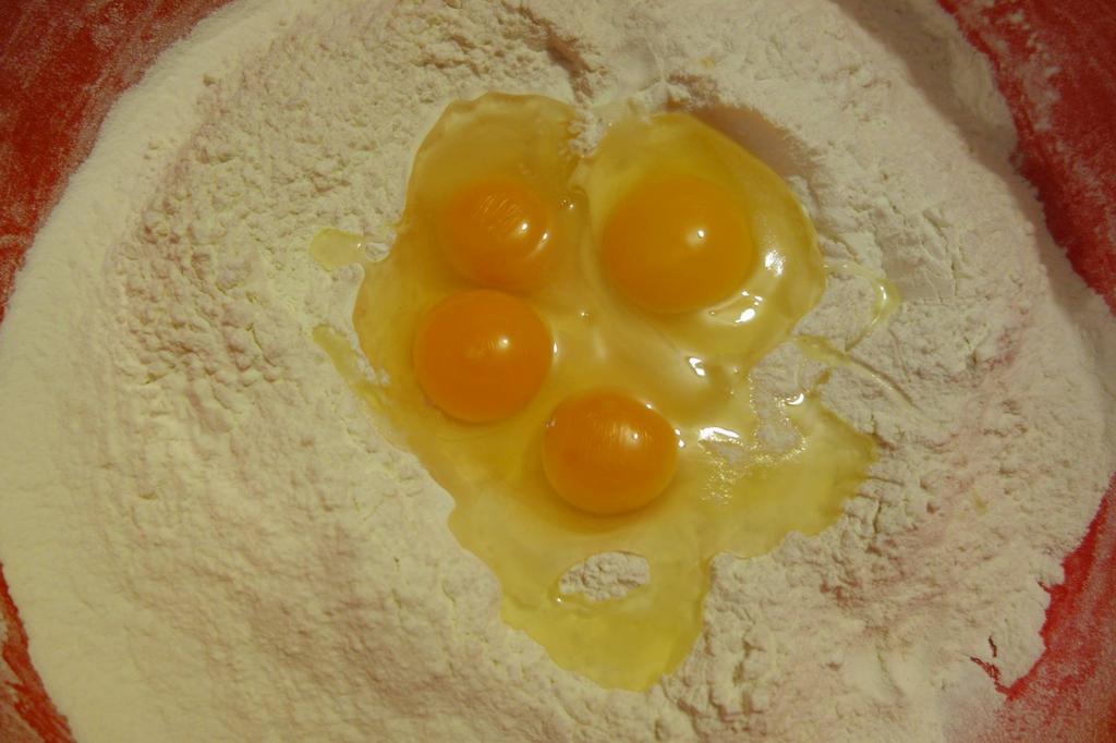 „Ca să faci mâncarea aiasta a hi musai să tie pui și să faci razalăii. Numa am gânit că ț-am spus cum să fac razalăii, da nu ț-am spus… ț-oi spunie amu. Iei tri, patru uauă din cuibar, tre să hie proaspetie, că ai die undie, așe, pui fărina trecută pân sâtă pă lopitău mare die coptături, faci așe on culcuș în fărină și sparji uauăle înlontru culcușuli, amesteci di-enceput c-o furcuță ș-api cu mâna frămânț on aluat ca die tomaji, da mai vârtos. Cum ț-am spus, numa uauă și fărină, nu mai adauji nimnică altăce. Numa sare, să nu uit!