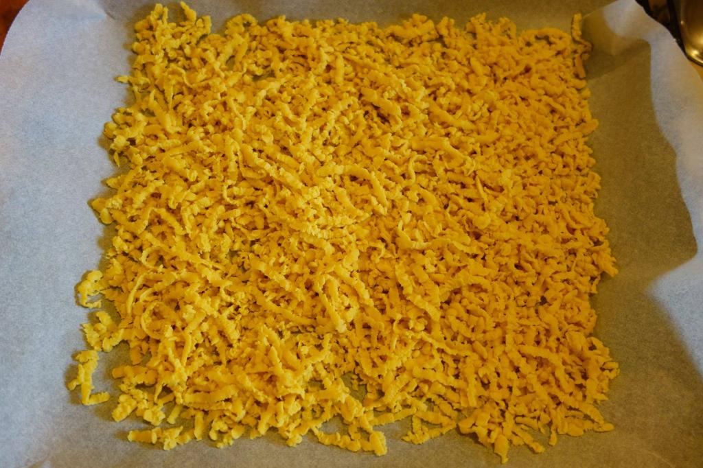 Dai aluatu ista pă razalău și întinz razalăii p-o ștergură curată, să nu steie păstăolaltă. Îi lași să să uștie di pă o zî pă alta. Când s-o uscat, îi pui înt-o tăpșie di-aceie în carie faci turtiele și baji tăpșia în leru încălzât, da nu tare, nu arz razalăii, numa le dai așe o față! Încălzăști leru cum ț-am spus și oprești focu, numa dup-aceie baji razalăii. Razalăii iștia îi poț punie în mâncare și proaspeț, numa zvântaț on ptic.