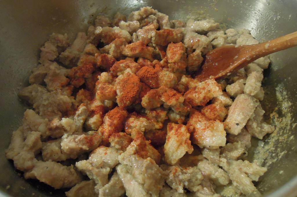 Noa, amu că ai razalăii, tie poț apuca die mâncarea aiasta. Tai pecia coștie, pui păstă ie sare și thiperi, la thiperi nu tie șăinăli, mai pui tri linguri die fărină nulaș, scuturi vasu în care le-ai pus, să să amestece binie. Pregătești on laboș mai larg, pui oloi și friji binie carnia pă tăitie părțâle. Nu pui fărină numa câtă țânie carnia pă ie și amesteci una-n-truna. Pui poprică dulce păstă carnie, da așe di-o lăture cu laboșu, nu pă foc, cum ț-am mai spus. Să ai pregătită o finjie die apă rece să torni păstă carnie, tăt amesteci. Di la fărină ii vide că să face o îngroșală pă care tu tăt o lunjești cu apă. Pui ciapă verdie tăietă, sare și thiperi, dacă gâniești că mai trebe. Lași să hiarbă cătingan, nu tie grăbdi că n-ai pântu ce.